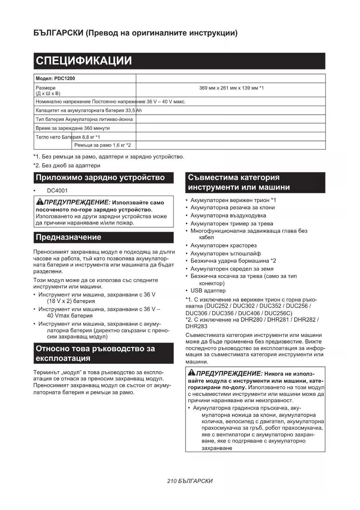 - DC4001 ПРЕДУПРЕЖДЕНИЕ: Използвайте само посоченото по-горе зарядно устройство. Използването на други зарядни устройства може да причини нараняване и/или пожар. Предназначение Преносимият захранващ модул е подходящ за дълги часове на работа, тъй като позволява акумулатор- ната батерия и инструмента или машината да бъдат