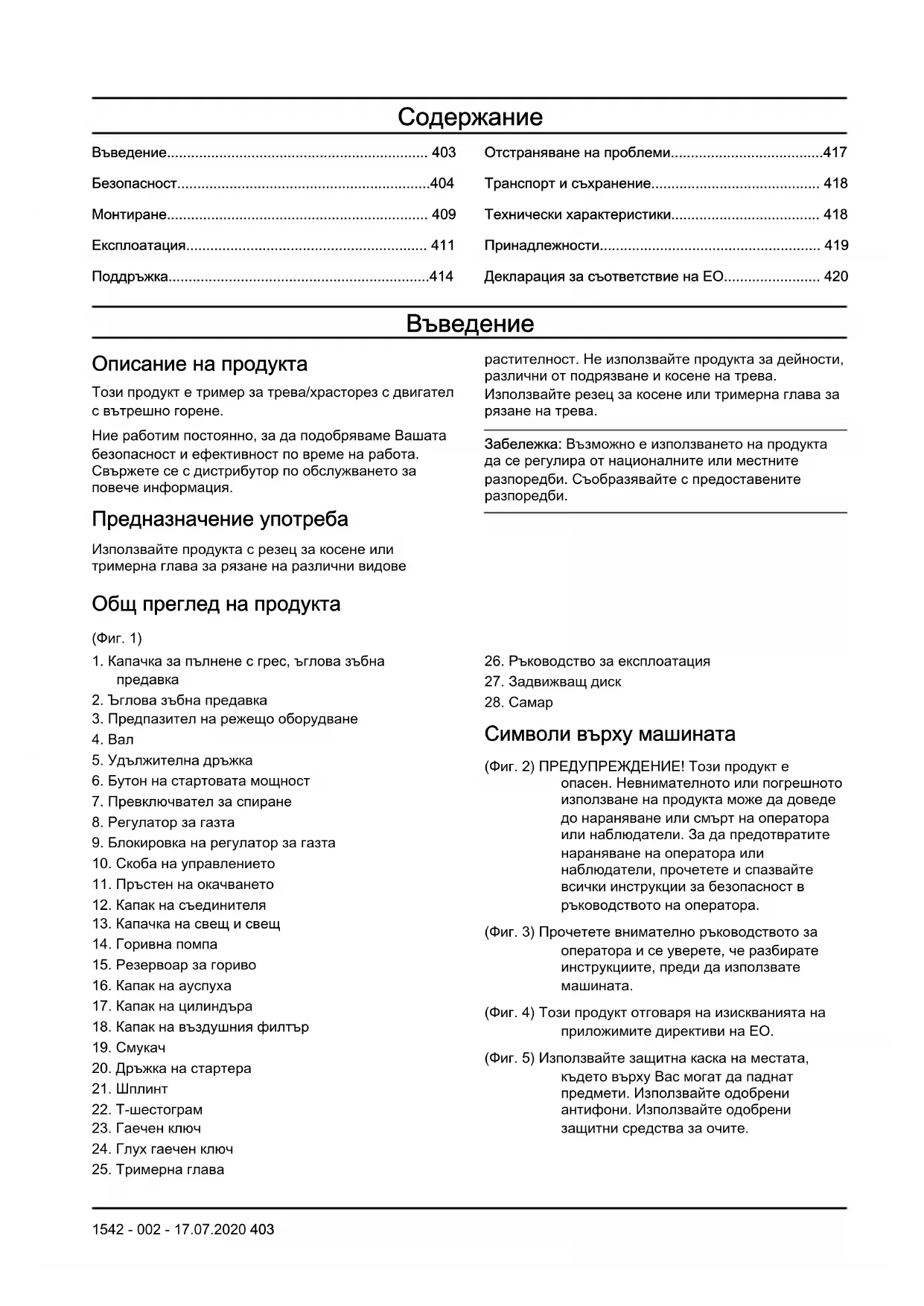 (Фиг. 4) Този продукт отговаря на изискванията на приложимите директиви на EO. (Фиг. 5) Използвайте защитна каска на местата, където върху Вас могат да паднат предмети. Използвайте одобрени антифони. Използвайте одобрени защитни средства за очите. 1542 - 002 - 17.07.2020 403(Фиг. 6) Използвайте одобрени защитни