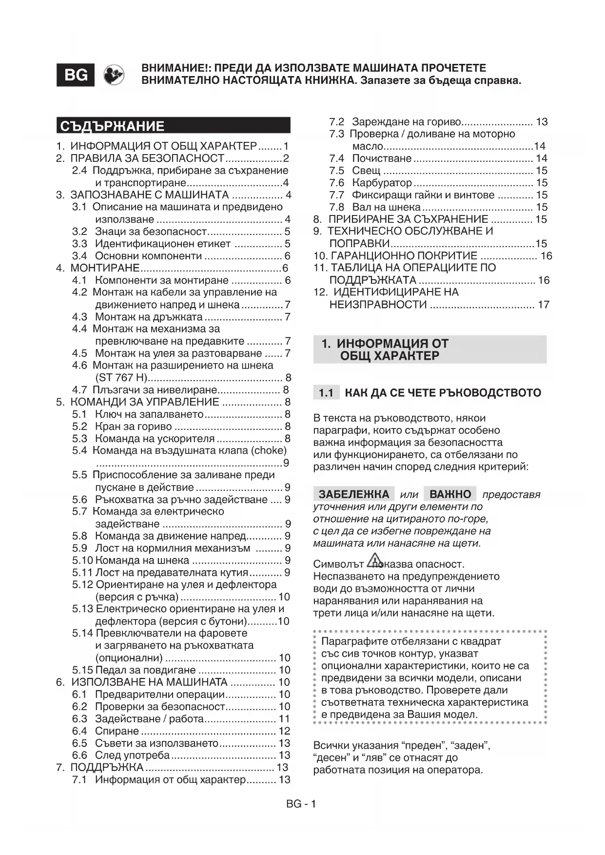 Прочетете внимателно настоящите инструкции преди да използвате машината. Разучете и свикнете с командите и с подходящото използване на машината. Научете се да изключвате бързо двигателя. Неспазването на предупрежденията и инструкциите може да причини инциденти и/или сериозни наранявания. Запазете всички упътвания и инструкции за бъдещи справки.
