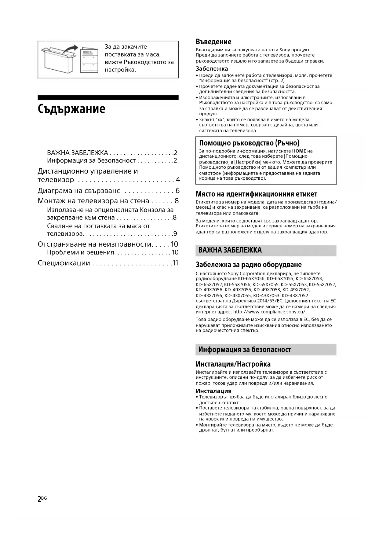 - Преди да започнете работа с телевизора, моля, прочетете “Информация за безопасност” (стр. 2).• Прочетете дадената документация за безопасност за допълнителни сведения за безопасността.• Изображенията и илюстрациите, използвани в Ръководството за настройка и в това ръководство, са само за справка и може да се различават от действителния продукт.• Знакът “xx”, който се появява в името на модела, съответства на номер, свързан с дизайнa, цвета или системата на телевизора. Място на идентификационния етикет Етикетите за номер на модела, дата на производство (година/месец) и клас на захранване, са разположени на гърба на телевизора или опаковката.За модели, които се доставят със захранващ адаптор:Етикетите за номер на модел и сериен номер на захранващия адаптор са разположени отдолу на захранващия адаптор. ВАЖНА ЗАБЕЛЕЖКА Забележка за радио оборудване С настоящото Sony Corporation декларира, че типовете радиооборудване KD-65X7056, KD-65X7055, KD-65X7053, KD-65X7052, KD-55X7056, KD-55X7055, KD-55X7053, KD-55X7052, KD-49X7056, KD-49X7055, KD-49X7053, KD-49X7052, KD-43X7056, KD-43X7055, KD-43X7053, KD-43X7052 съответстват на Директива 2014/53/ЕС. Цялостният текст на ЕС декларацията за съответствие може да се намери на следния интернет адрес: http://www.compliance.sony.eu/Това радио оборудване може да се използва в ЕС, без да се нарушават приложимите изисквания относно използването на радиочестотния спектър. Информация за безопасност Инсталация/Настройка Инсталирайте и използвайте телевизора в съответствие с инструкциите, описани по-долу, за да избегнете риск от пожар, токов удар или повреда и/или наранявания.