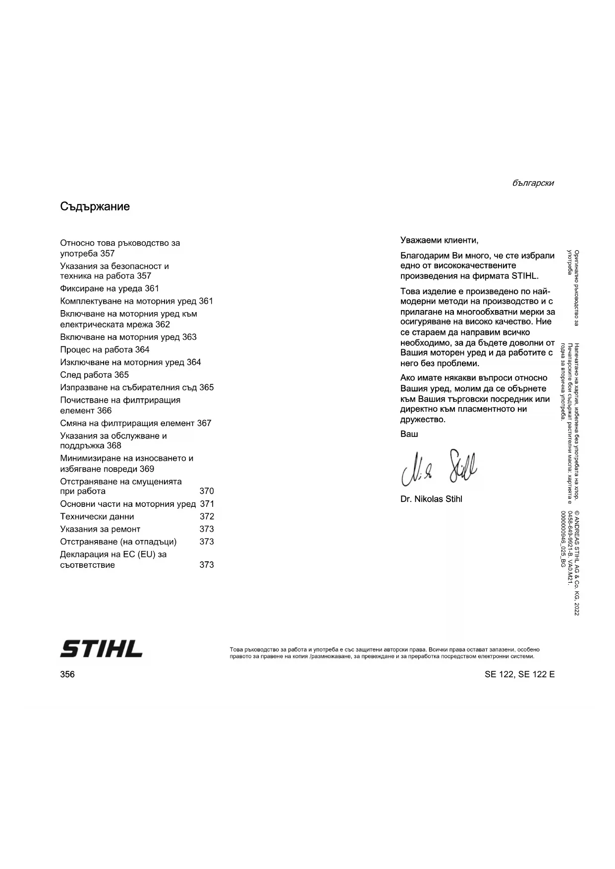 Dr. Nikolas Stihl Относно това ръководство за употреба 357 Указания за безопасност и техника на работа 357 Фиксиране на уреда 361 Комплектуване на моторния уред 361 Включване на моторния уред към електрическата мрежа 362 Включване на моторния уред 363 Процес на работа 364 Изключване на моторния уред 364 След работа 365 Изпразване на събирателния съд 365 Почистване на филтриращия елемент 366 Смяна на филтриращия елемент 367 Указания за обслужване и поддръжка 368 Минимизиране на износването и избягване повреди 369 Отстраняване на смущенията при работа 370 Основни части на моторния уред 371 Технически данни 372 Указания за ремонт 373 Отстраняване (на отпадъци) 373 Декларация на ЕС (EU) за съответствие 373SE 122, SE 122 E