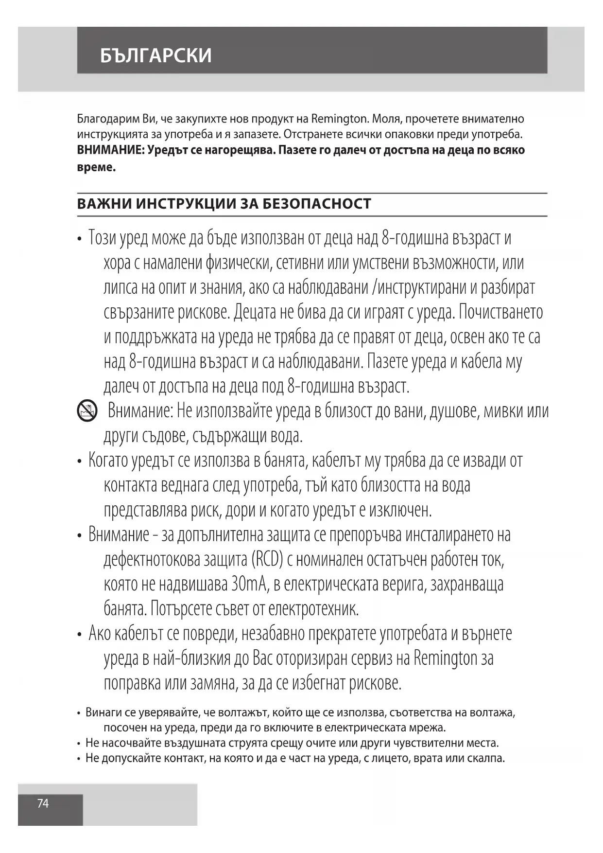 AE74 Благодарим Ви, че закупихте нов продукт на Remington. Моля, прочетете внимателно инструкцията за употреба и я запазете. Отстранете всички опаковки преди употреба. ВНИМАНИЕ: Уредът се нагорещява. Пазете го далеч от достъпа на деца по всяко
