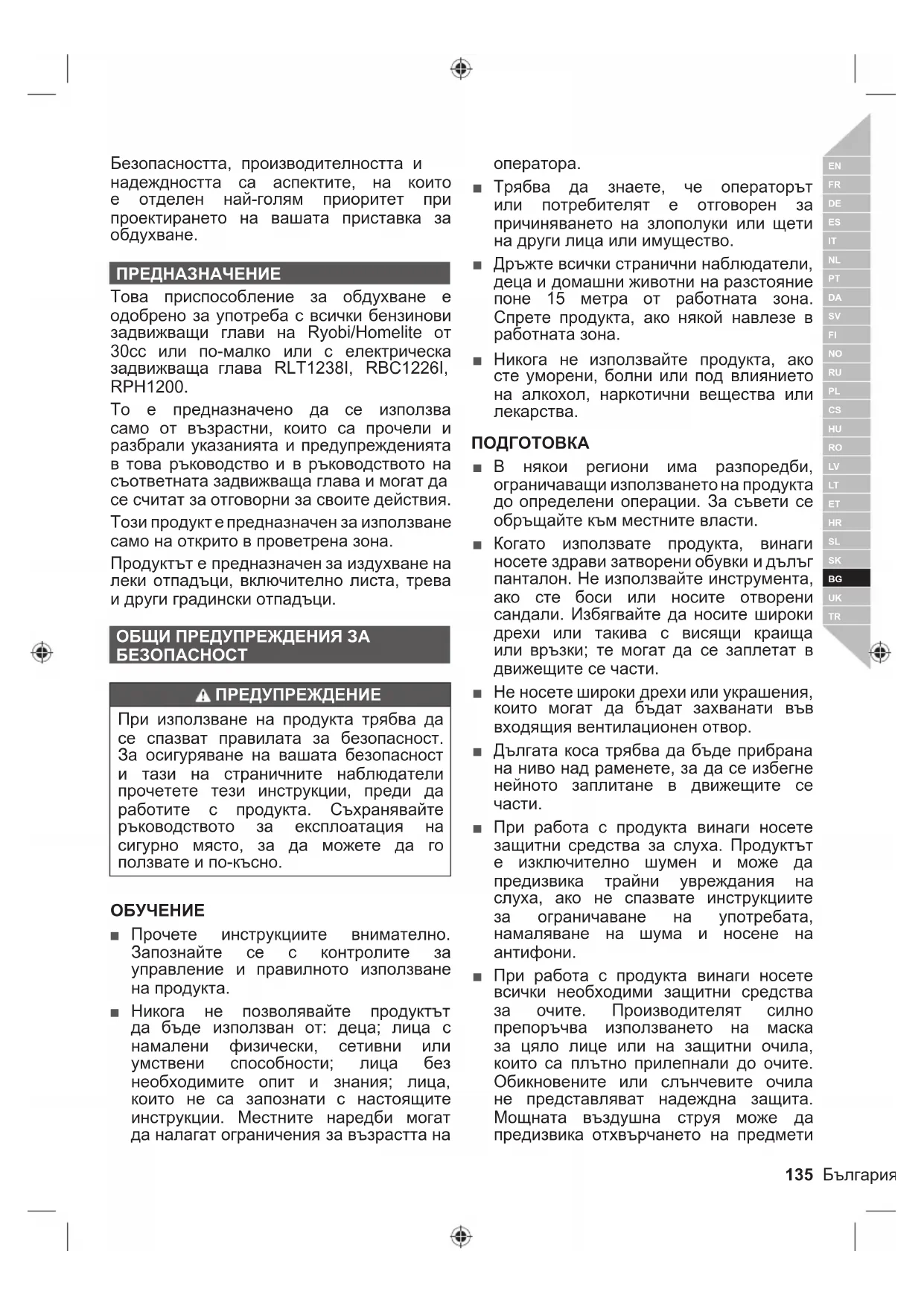 ПРЕДНАЗНАЧЕНИЕ Това приспособление за обдухване е одобрено за употреба с всички бензинови задвижващи глави на Ryobi/Homelite от 30cc или по-малко или с електрическа задвижваща глава RLT1238I, RBC1226I, RPH1200. То е предназначено да се използва само от възрастни, които са прочели и разбрали указанията и предупрежденията в това ръководство и в ръководството на съответната задвижваща глава