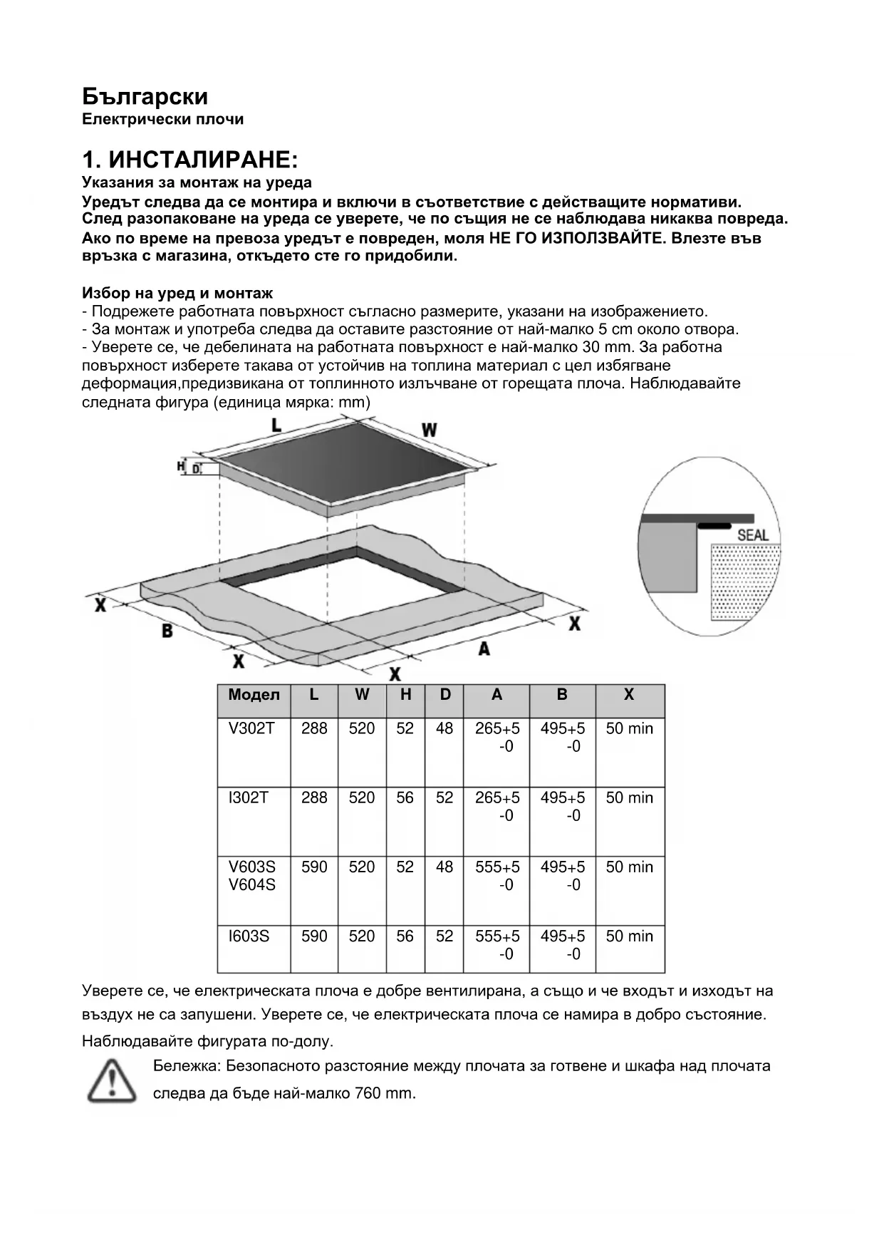 50 min Уверете се, че електрическата плоча е добре вентилирана, а също и че входът и изходът на въздух не са запушени. Уверете се, че електрическата плоча се намира в добро състояние. Наблюдавайте фигурата по-долу. Бележка: Безопасното разстояние между плочата за готвене и шкафа над плочата следва да бъде най-малко 760 mm.A(mm) B(mm) C(mm)