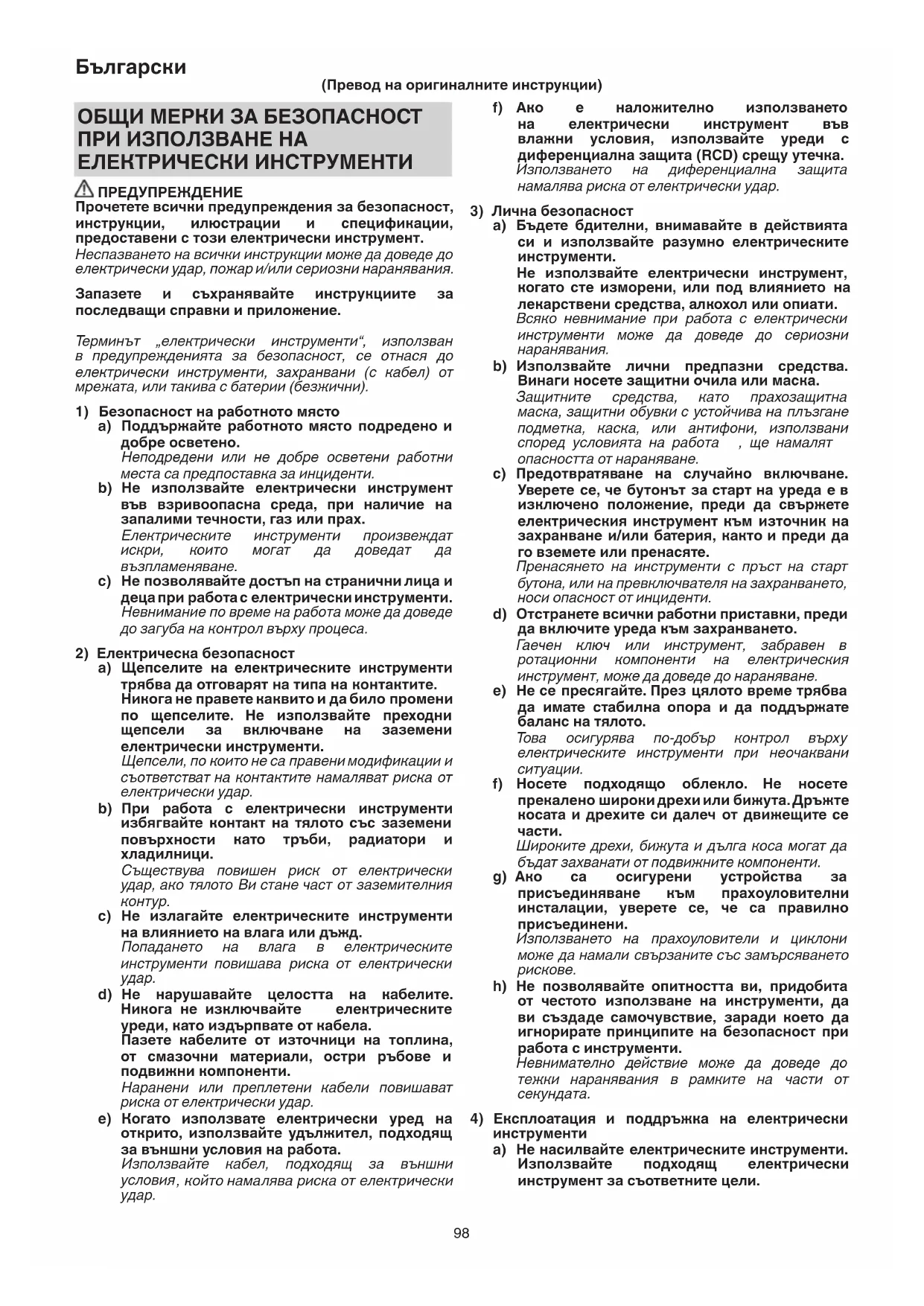 инструменти a) Не насилвайте електрическите инструменти. Използвайте подходящ електрически инструмент за съответните цели. ОБЩИ МЕРКИ ЗА БЕЗОПАСНОСТ ПРИ ИЗПОЛЗВАНЕ НА ЕЛЕКТРИЧЕСКИ ИНСТРУМЕНТИ ПРЕДУПРЕЖДЕНИЕ Прочетете всички предупреждения за безопасност, инструкции, илюстрации и спецификации, предоставени с този електрически инструмент. Неспазването на всички инструкции може да доведе до електрически удар, пожар и/или сериозни наранявания. Запазете и съхранявайте инструкциите за последващи справки и приложение. Терминът „електрически инструменти“, използван в предупрежденията за безопасност, се отнася до електрически инструменти, захранвани (с кабел) от мрежата, или такива с батерии (безжични).
