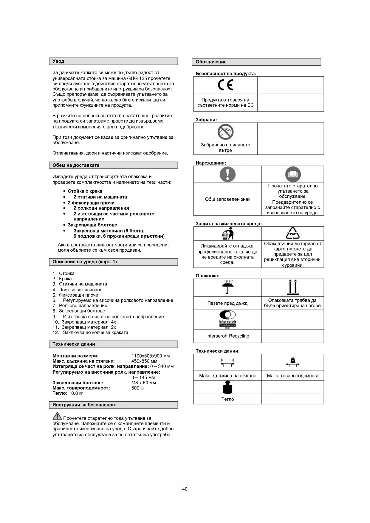 Comandă nr.: #94713 Directive UE aferente: 20006/42 EG Data/semnătura producătorului: 12.12.2011 Date despre semnatar: director domnul Arnold Documentație tehnică: J. Bürkle FBL; QS 39Увод За да имате колкото се може по-дълго радост от универсалната стойка за машина GUG 135 прочетете си преди пускане в действие старателно упътването за обслужване и прибавените инструкции за безопасност. Също препоръчваме, да съхранявате упътването за употреба в случай, че по-късно бихте искали да си припомните функциите на продукта. В рамките на непрекъснатото по-нататъшно развитие на продукта си запазваме правото да извършваме технически изменения с цел подобряване. При този документ се касае за оригинално упътване за обслужване. Отпечатвания, дори и частични изискват одобрение. Обем на доставката Извадете уреда от транспортната опаковка и проверете комплектността и наличието на тези части:
