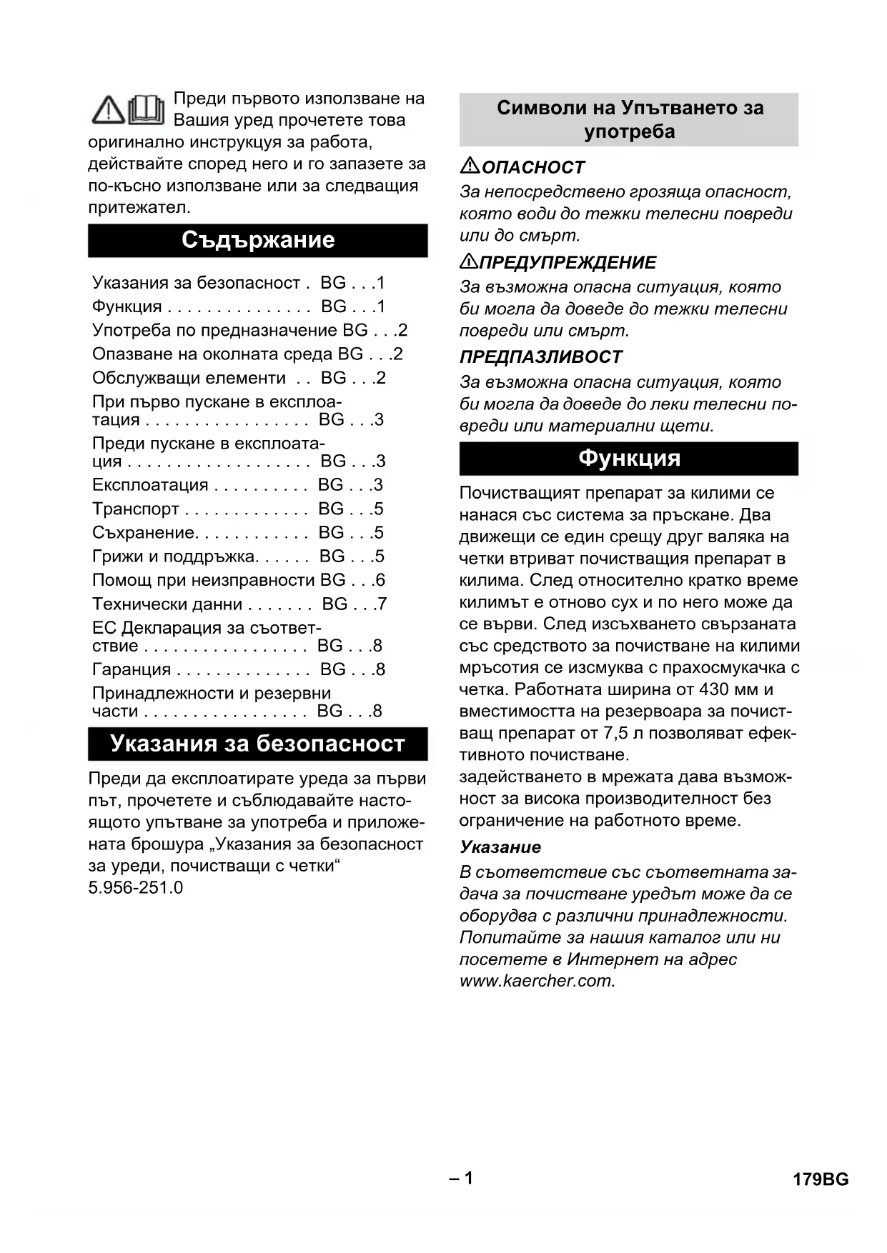 Chairman of the Board of Management Director Regulatory Affairs & Certification Garancija Pribor i rezervni delovi 178 SR– 1 Преди първото използване на Вашия уред прочетете това оригинално инструкцуя за работа, действайте според него и го запазете за по-късно използване или за следващия притежател. Преди да експлоатирате уреда за първи път, прочетете и съблюдавайте насто- ящото упътване за употреба и приложе- ната брошура „Указания за безопасност за уреди, почистващи с четки“ 5.956-251.0