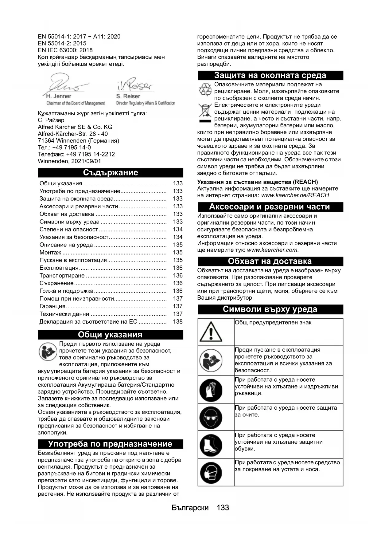 : Акумулаторна градинска пръскачка Тип: 1.145-xxx Приложими директиви на ЕС 2006/42/ЕО (+2009/127/ЕО) 2014/30/ЕС 2011/65/ЕС Приложими хармонизирани стандарти EN 60745-1 EN 50580:2014 EN 62233: 2008 EN 55014-1: 2017 + A11: 2020 EN 55014-2: 2015 EN IEC 63000: 2018 Подписващите лица действат от името и като пълномощници на управителния орган. Пълномощник по документацията: S. Reiser Alfred Kärcher SE & Co. KG Alfred-Kärcher-Str. 28 - 40 71364 Winnenden (Germany) Тел.: +49 7195 14-0 Факс: +49 7195 14-2212 Виненден, 2021/09/01