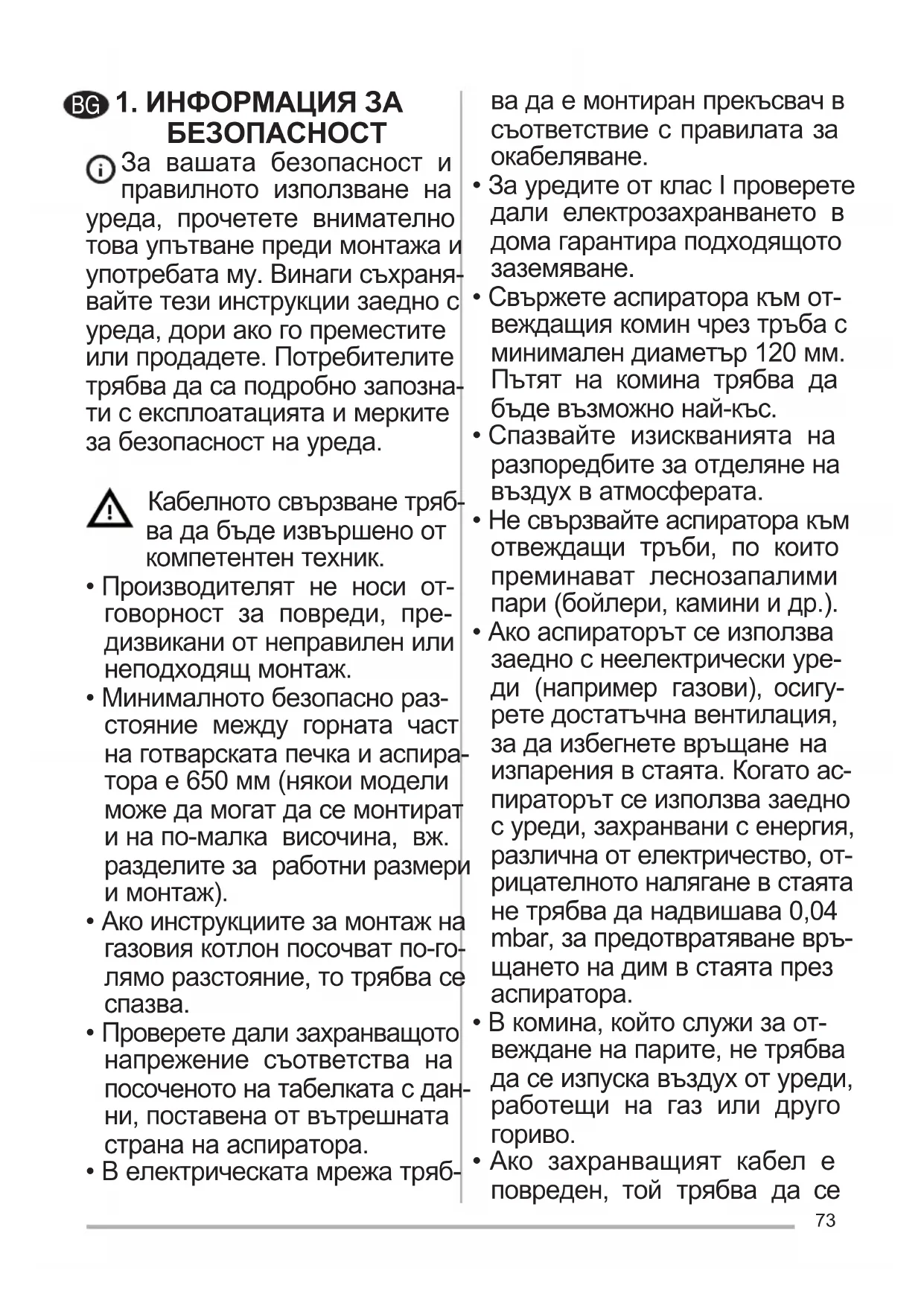 - V prípade potreby výmeny kontaktujte technický servis („Ohľadom nákupu kontaktujte prosím technický servis“).73 1.ИНФОРМАЦИЯЗА БЕЗОПАСНОСТ За вашата безопасност и правилното използване на уреда, прочетете внимателно това упътване преди монтажа и употребата му. Винаги съхраня- вайте тези инструкции заедно с уреда, дори ако го преместите или продадете. Потребителите трябва да са подробно запозна- ти с експлоатацията и мерките за безопасност на уреда. Кабелното свързване тряб- ва да бъде извършено от компетентен техник.