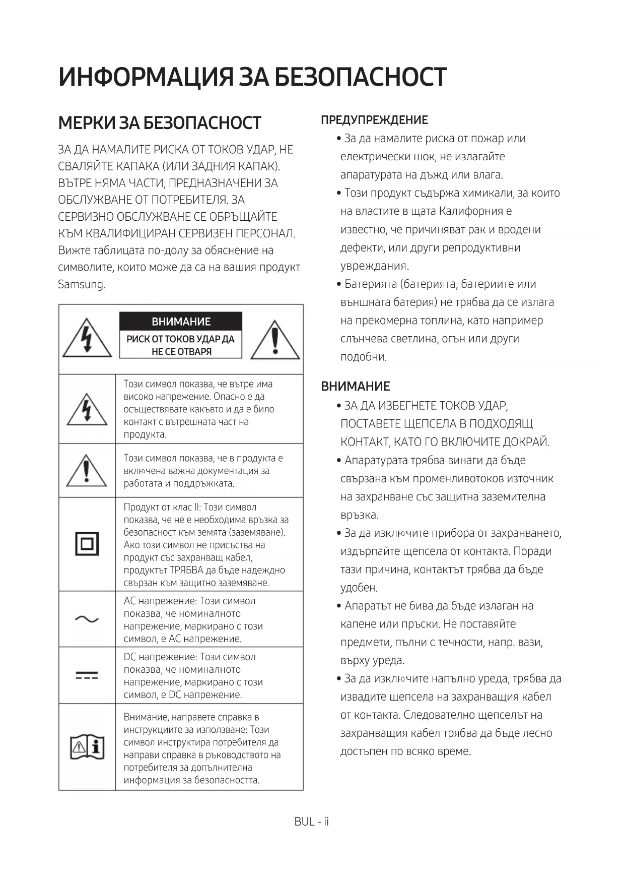 - В изключително студена или гореща среда зареждането се прекратява с цел безопасност. За да разрешите тези проблеми, изключете AC захранващия кабел и го свържете отново при работна температура между 5°C и 35°C.BUL - 31 С настоящото Samsung декларира, че това радиооборудване е в съответствие с Директива 2014/53/ЕС и с приложимите законови изисквания на Обединеното кралство. Пълният текст на декларацията за съответствие е наличен на следния интернет адрес: http://www.samsung.com, като отидете на Поддръжка и въведете името на модела. Този уред може да се използва във всички страни на ЕС и в Обединеното кралство. [Правилноизхвърляненабатериитевтозипродукт] (Наличновстранисъссистемизаразделносметосъбиране) Това обозначение върху батерията, ръководството или опаковката, показва, че батериите в този продукт не бива да се изхвърлят с другите битови отпадъци в края на техния полезен живот. Където са маркирани, химическите символи Hg, Cd или Pb показват, че батерията съдържа живак, кадмий или олово над контролните нива в Директива 2006/66 на ЕО. Ако батериите не се изхвърлят правилно, тези вещества могат да предизвикат увреждане на човешкото здраве или на околната среда. За да предпазите природните ресурси и за да съдействате за многократната употреба на материалните ресурси, моля отделяйте батериите от другите видове отпадъчни продукти и ги рециклирайте посредством Вашата локална система за безплатно връщане на батерии. Правилнотретираненаизделиетоследкраянаексплоатационниямуживот (Отпадъци,представляващиелектрическоиелектроннооборудване) (Наличновстранисъссистемизаразделносметосъбиране) Tози знак, поставен върху изделието, негови принадлежности или печатни материали, означава, че продуктът и принадлежностите (например зарядно устройство, слушалки, USB кабел) не бива да се изхвърлят заедно с другите битови отпадъци, когато изтече експлоатационният му живот. Отделяйте тези устройства от другите видови отпадъци и ги предавайте за рециклиране. Спазвайки това правило не излагате на опасност здравето на други хора и предпазвате околната среда от замърсяване, предизвикано от безконтролно изхвърляне на отпадъци. Освен това, подобно отговорно поведение създава възможност за повторно (екологично съобразно) използване на материалните ресурси. Домашните потребители трябва да се свържат с търговеца на дребно, от когото са закупили изделието, или със съответната местна държавна агенция, за да получат подробни инструкции къде и кога могат да занесат тези устройства за рециклиране, безопасно за околната среда. Корпоративните потребители следва да се свържат с доставчика си и да проверят условията на договора за покупка. Това изделие и неговите електронни принадлежности не бива да се сместват с другите отпадъци на търговското предприятие. За информация относно ангажиментите на Samsung по отношение на околната среда и специфичните за продукта регулаторни задължения, например REACH, WEEE, батерии, посетете: www.samsung.com/uk/aboutsamsung/sustainability/environment/our-commitment/data/CRO - ii SIGURNOSNE INFORMACIJE SIGURNOSNA UPOZORENJA DA BISTE SMANJILI OPASNOST OD ELEKTRIČNOG