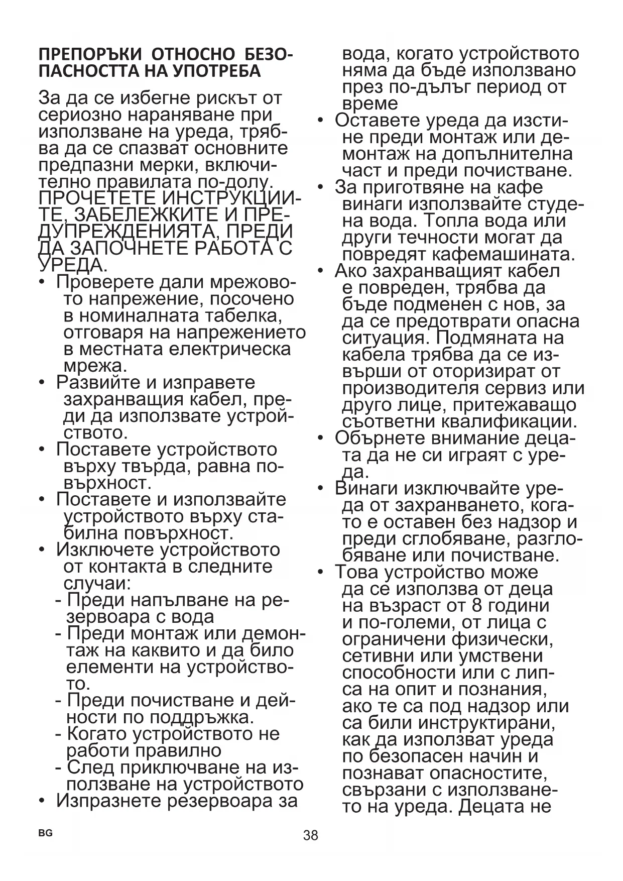 - Esta oleosidad puede ocurrir con mayor frecuencia al usar cafés tostados intensamente. ES38 ПРЕПОРЪКИ ОТНОСНО БЕЗО- ПАСНОСТТА НА УПОТРЕБА За да се избегне рискът от сериозно нараняване при използване на уреда, тряб- ва да се спазват основните предпазни мерки, включи- телно правилата по-долу. ПРОЧЕТЕТЕ ИНСТРУКЦИИ- ТЕ, ЗАБЕЛЕЖКИТЕ И ПРЕ- ДУПРЕЖДЕНИЯТА, ПРЕДИ ДА ЗАПОЧНЕТЕ РАБОТА С