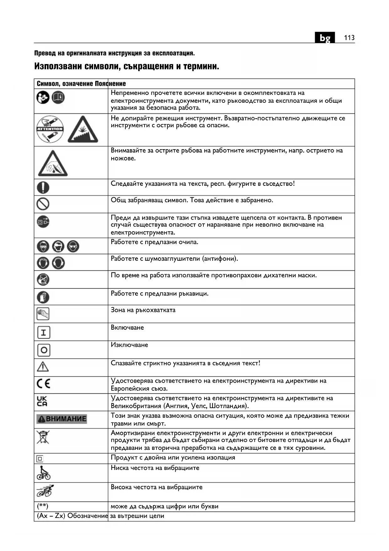 Спазвайте стриктно указанията в съседния текст! Удостоверява съответствието на електроинструмента на директиви на Европейския съюз. Удостоверява съответствието на електроинструмента на директивите на Великобритания (Англия, Уелс, Шотландия). Този знак указва възможна опасна ситуация, която може да предизвика тежки травми или смърт. Амортизирани електроинструменти и други електронни и електрически продукти трябва да бъдат събирани отделно от битовите отпадъци и да бъдат предавани за вторична преработка на съдържащите се в тях суровини. Продукт с двойна или усилена изолация Ниска честота на вибрациите Висока честота на вибрациите (**) може да съдържа цифри или букви (Ax – Zx) Обозначение за вътрешни цели114