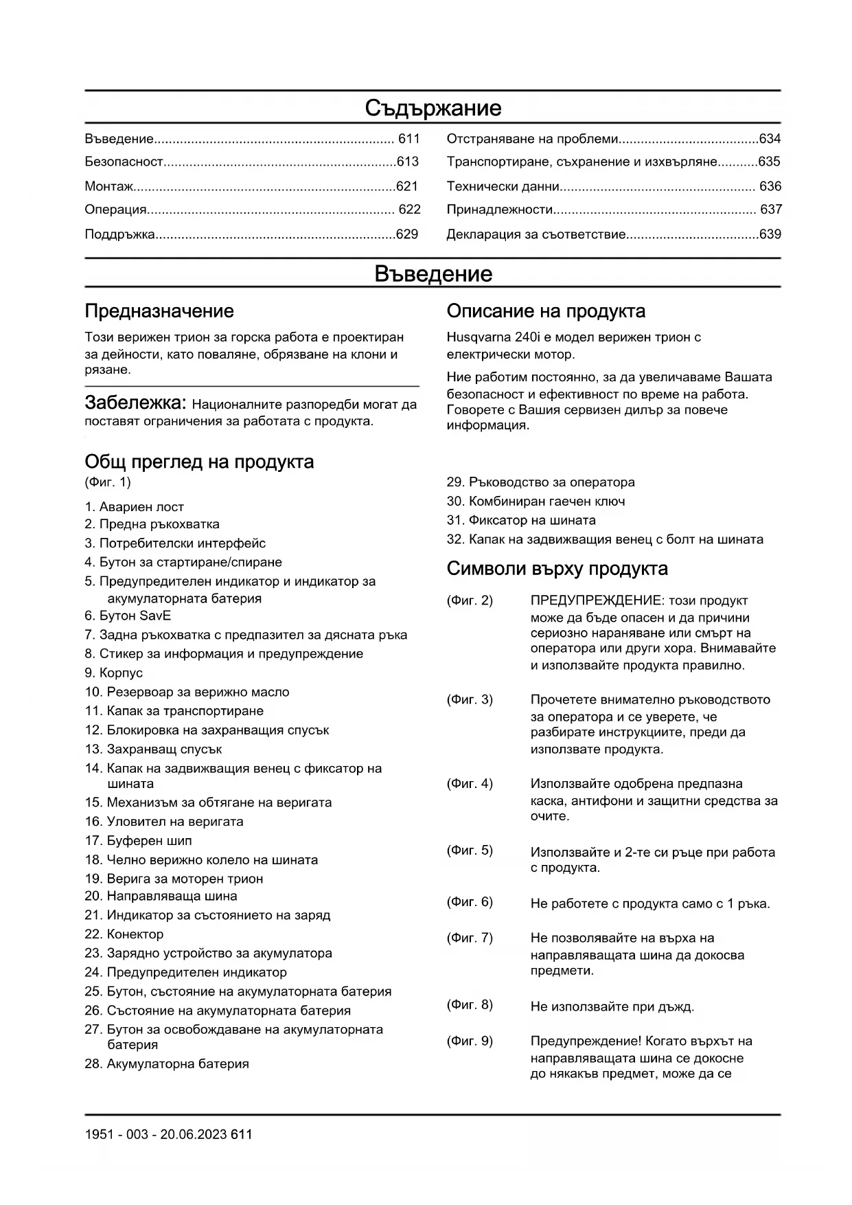 Забележка: Националните разпоредби могат да поставят ограничения за работата с продукта. Описание на продукта Husqvarna 240i е модел верижен трион с електрически мотор. Ние работим постоянно, за да увеличаваме Вашата безопасност и ефективност по време на работа. Говорете с Вашия сервизен дилър за повече информация. Общ преглед на продукта (Фиг. 1)