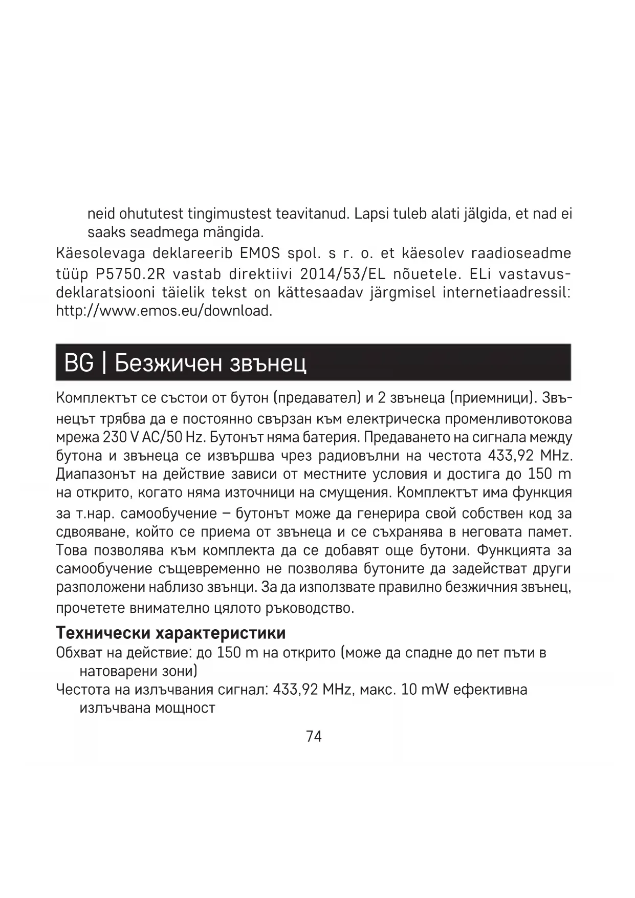 - Seadet ei tohi kasutada isikud (sh lapsed), kellel on füüsilised, mee- leoorganite või vaimsed puuded, või isikud, kellel puuduvad piisavad kogemused ja teadmised, et seadet ohutult kasutada, välja arvatud juhul kui see toimub järelevalve all või nende turvalisuse eest vastutav isik on74 neid ohututest tingimustest teavitanud. Lapsi tuleb alati jälgida, et nad ei saaks seadmega mängida. Käesolevaga deklareerib EMOS spol. s r. o. et käesolev raadioseadme tüüp P5750.2R vastab direktiivi 2014/53/EL nõuetele. ELi vastavus- deklaratsiooni täielik tekst on kättesaadav järgmisel internetiaadressil: http://www.emos.eu/download. BG | Безжичен звънец Комплектът се състои от бутон (предавател) и 2 звънеца (приемници). Звъ- нецът трябва да е постоянно свързан към електрическа променливотокова мрежа 230 V AC/50 Hz. Бутонът няма батерия. Предаването на сигнала между бутона и звънеца се извършва чрез радиовълни на честота 433,92 MHz. Диапазонът на действие зависи от местните условия и достига до 150 m на открито, когато няма източници на смущения. Комплектът има функция за т.нар. самообучение – бутонът може да генерира свой собствен код за сдвояване, който се приема от звънеца и се съхранява в неговата памет. Това позволява към комплекта да се добавят още бутони. Функцията за самообучение същевременно не позволява бутоните да задействат други разположени наблизо звънци. За да използвате правилно безжичния звънец, прочетете внимателно цялото ръководство. Технически характеристики Обхват на действие: до 150 m на открито (може да спадне до пет пъти в натоварени зони) Честота на излъчвания сигнал: 433,92 MHz, макс. 10 mW ефективна излъчвана мощност75 Бутон: водоустойчив; IP44 степен на защита Свързване на звънеца с бутоните: самообучаваща функция Максимален брой свързани бутони: макс. 8 бутона Брой мелодии: 10 Захранване на звънеца: 230 V AC/50 Hz Захранване на бутона: без батерия Комплектът включва: двустранна залепваща лента Описание на звънеца (вж. фиг. 1) 1 – светодиод на звънеца 2 – бутон за сдвояване/регулира- не на силата на звука 3 – промяна на тона на звънене 4 – високоговорител Описание на бутона (вж. фиг. 2) 1 – светодиод на бутона 2 – бутон за позвъняване 3 – отвор за отваряне на капачето на батериите 4 – отвори за монтиране на стена Сдвояване на бутона със звънеца