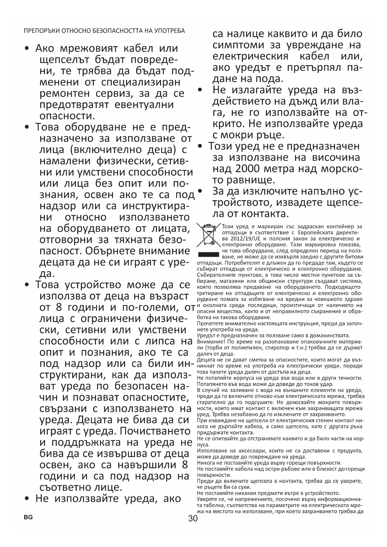 - За да изключите напълно ус- тройството, извадете щепсе- ла от контакта. Този уред е маркиран със задраскан контейнер за отпадъци в съответствие с Европейската директи- ва 2012/19/UE и полския закон за електрическо и електронно оборудване. Тази маркировка показва, че това оборудване, след определен период на полз- ване, не може да се изхвърля заедно с другите битови отпадъци. Потребителят е длъжен да го предаде там, където се събират отпадъци от електрическо и електронно оборудване. Събирателните пунктове, в това число местни пунктове за съ- биране, магазини или общински структури създават система, която позволява предаване на оборудването. Подходящото третиране на отпадъците от електрическо и електронно обо- рудване помага за избягване на вредни за човешкото здраве и околната среда последици, произтичащи от наличието на опасни вещества, както и от неправилното съхранение и обра- ботка на такова оборудване. Прочетете внимателно настоящата инструкция, преди да започ- нете употреба на уреда. Уредът е предназначен за ползване само в домакинствата. Внимание! По време на разопаковане опаковъчните материа- ли (торби от полиетилен, стиропор и т.н.) трябва да се държат далеч от деца. Децата не си дават сметка за опасностите, които могат да въз- никнат по време на употреба на електрически уреди, поради това пазете уреда далеч от достъпа на деца. Не потапяйте корпуса на уреда във вода или в други течности. Потапянето във вода може да доведе до токов удар. В случай на заливане с вода на външните елементи на уреда, преди да го включите отново към електрическата мрежа, трябва старателно да го подсушите. Не докосвайте мокрите повърх- ности, които имат контакт с включен към захранващата мрежа уред. Трябва незабавно да го изключите от захранването. При изваждане на щепсела от електрическия стенен контакт ни- кога не дърпайте кабела, а само щепсела, като с другата ръка придържате контакта. Не се опитвайте да отстранявате каквито и да било части на кор-