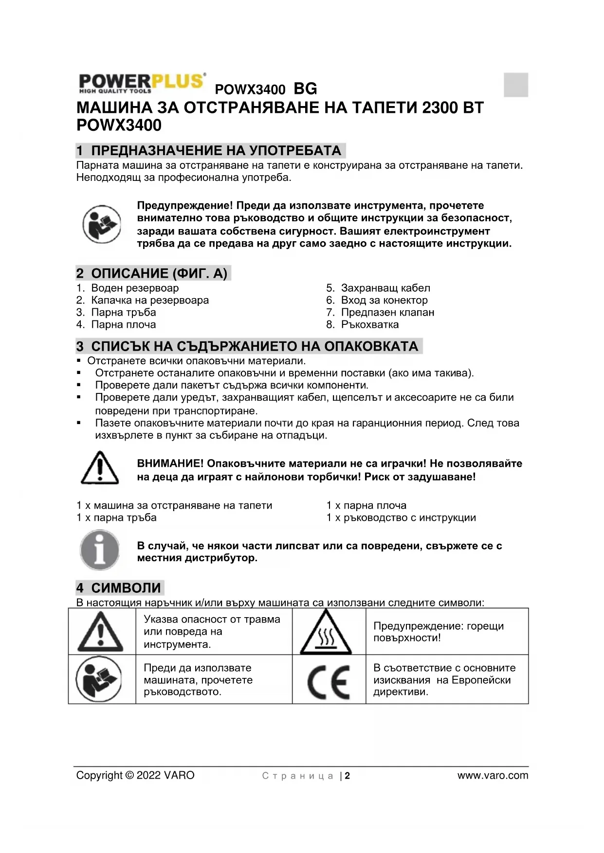 - 13 ДЕКЛАРАЦИЯ ЗА СЪОТВЕТСТВИЕ POWX3400 BG Copyright © 2022 VARO С т р а н и ц а | 2 www.varo.com МАШИНА ЗА ОТСТРАНЯВАНЕ НА ТАПЕТИ 2300 ВТ POWX3400 1 ПРЕДНАЗНАЧЕНИЕ НА УПОТРЕБАТА Парната машина за отстраняване на тапети е конструирана за отстраняване на тапети. Неподходящ за професионална употреба. Предупреждение! Преди да използвате инструмента, прочетете внимателно това ръководство и общите инструкции за безопасност, заради вашата собствена сигурност. Вашият електроинструмент трябва да се предава на друг само заедно с настоящите инструкции. 2 ОПИСАНИЕ (ФИГ. A) p. 8