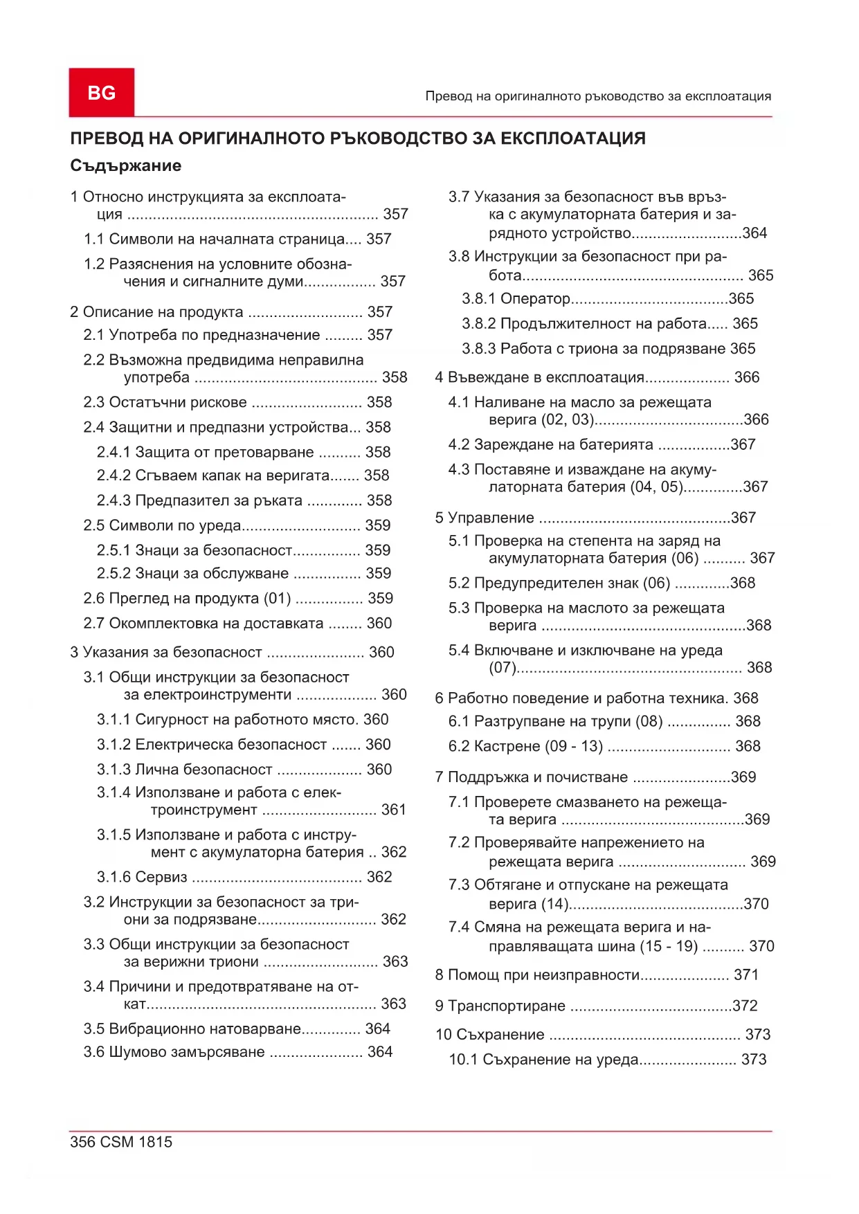 10 Фиксиращ пръстен за капака на зъб- ното колело на веригата 11 Направляваща шина 12 Режеща верига 13 Ограничител 14 Предпазител за ръката 15 Индикатор за нивото на зареждане и предупредителен знак 16 Натиснете бутона, за да смажете режещата верига 17 Ъглови отвертки - кръстата и права 18 Шина за акумулатора 19* Батерия* 20* Зарядно устройство* 21 Калъф за пренасяне 22 Ръководство за работаBG 360 CSM 1815 Указания за безопасност Акумулаторната батерия 2,5 А·чи зарядно- то устройство са включени в комплекта (арт. № 114023). Акумулаторната батерия и зарядното устройство не са включени при единичното устройство (арт. № 114016). Вижте техническите данни на страници 6 и 7 и виж глава 12 "Технически данни", страни- ца374.