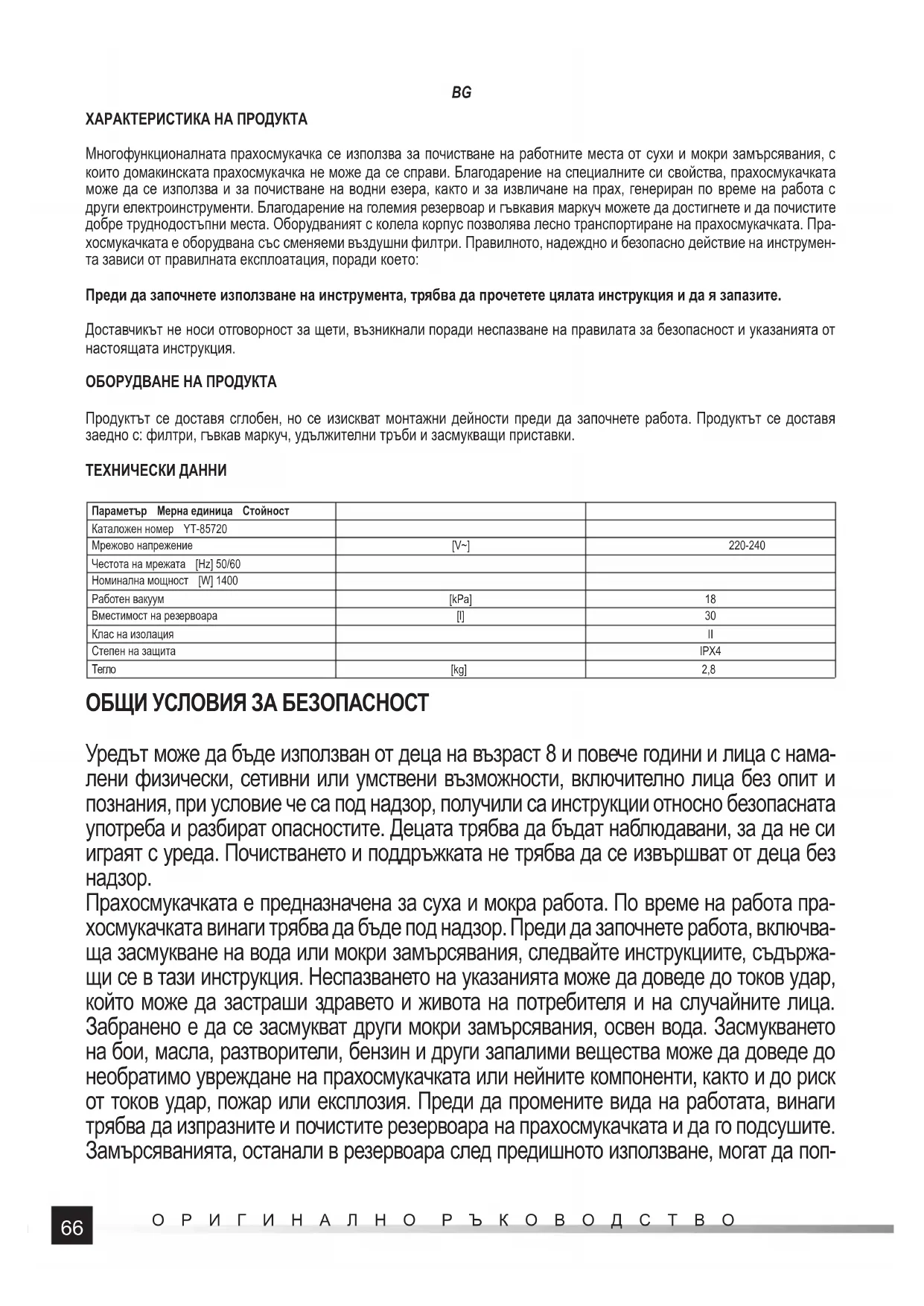 Преди да започнете използване на инструмента, трябва да прочетете цялата инструкция и да я запазите. Доставчикът не носи отговорност за щети, възникнали поради неспазване на правилата за безопасност и указанията от настоящата инструкция. ОБОРУДВАНЕ НА ПРОДУКТА Продуктът се доставя сглобен, но се изискват монтажни дейности преди да започнете работа. Продуктът се доставя заедно с: филтри, гъвкав маркуч, удължителни тръби и засмукващи приставки. ТЕХНИЧЕСКИ ДАННИ Параметър Мерна единица Стойност Каталожен номер YT-85720 Мрежово напрежение [V~] 220-240 Честота на мрежата [Hz] 50/60 Номинална мощност [W] 1400 Работен вакуум [kPa] 18 Вместимост на резервоара [l] 30 Клас на изолация II Степен на защита IPX4 Тегло [kg] 2,8 ОБЩИ УСЛОВИЯ ЗА БЕЗОПАСНОСТ Уредът може да бъде използван от деца на възраст 8 и повече години и лица с нама- лени физически, сетивни или умствени възможности, включително лица без опит и познания, при условие че са под надзор, получили са инструкции относно безопасната употреба и разбират опасностите. Децата трябва да бъдат наблюдавани, за да не си играят с уреда. Почистването и поддръжката не трябва да се извършват от деца без