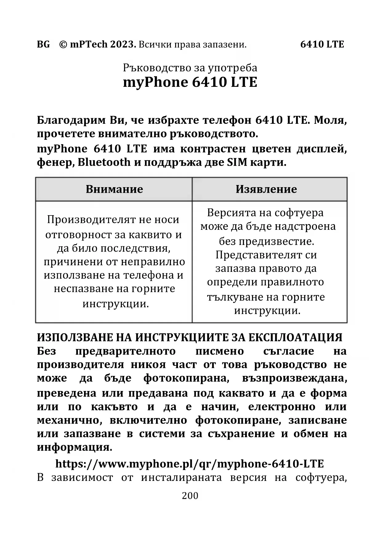 ИЗПОЛЗВАНЕ НА ИНСТРУКЦИИТЕ ЗА ЕКСПЛОАТАЦИЯ Без предварителното писмено съгласие на производителя никоя част от това ръководство не може да бъде фотокопирана, възпроизвеждана, преведена или предавана под каквато и да е форма или по какъвто и да е начин, електронно или механично, включително фотокопиране, записване или запазване в системи за съхранение и обмен на информация. https://www.myphone.pl/qr/myphone-6410-LTE В зависимост от инсталираната версия на софтуера,BG © mPTech 2023. Всички права запазени. 6410 LTE