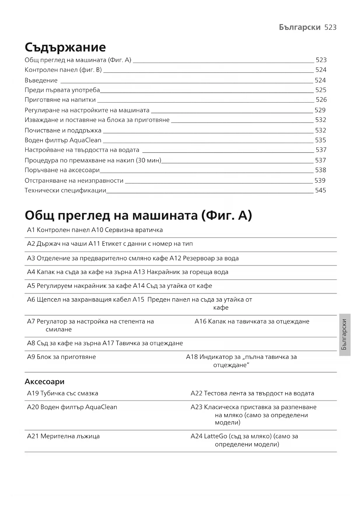 Общ преглед на машината (Фиг. А) ________________________________________________________ 523 Контролен панел (фиг. B) _________________________________________________________________ 524 Въведение ______________________________________________________________________________ 524 Преди първата употреба__________________________________________________________________ 525 Приготвяне на напитки ___________________________________________________________________ 526 Регулиране на настройките на машината __________________________________________________ 529 Изваждане и поставяне на блока за приготвяне ____________________________________________ 532 Почистване и поддръжка _________________________________________________________________ 532 Воден филтър AquaClean _________________________________________________________________ 535 Настройване на твърдостта на водата _____________________________________________________ 537 Процедура по премахване на накип (30 мин)_______________________________________________ 537 Поръчване на аксесоари__________________________________________________________________ 538 Отстраняване на неизправности __________________________________________________________ 539 Технически спецификации________________________________________________________________ 545 Общ преглед на машината (Фиг. А) A1 Контролен панел A10 Сервизна вратичка A2 Държач на чаши A11 Етикет с данни с номер на тип A3 Отделение за предварително смляно кафе A12 Резервоар за вода A4 Капак на съда за кафе на зърна A13 Накрайник за гореща вода A5 Регулируем накрайник за кафе A14 Съд за утайка от кафе A6 Щепсел на захранващия кабел A15 Преден панел на съда за утайка от