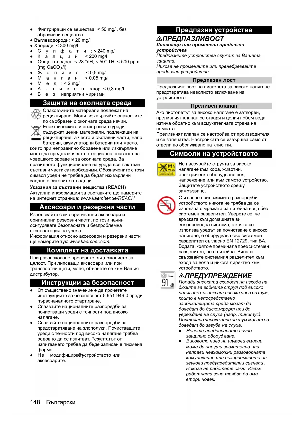 вилното функциониране на уреда все пак тези съставни части са необходими. Обозначените с този символ уреди не трябва да бъдат изхвърляни заедно с битовите отпадъци. Указания за съставни вещества (REACH) Актуална информация за съставките ще намерите на интернет страница: www.kaercher.de/REACH Аксесоари и резервни части Използвайте само оригинални аксесоари и оригинални резервни части, по този начин осигурявате безопасната и безпроблемна експлоатация на уреда. Информация относно аксесоари и резервни части ще намерите тук: www.kaercher.com. Комплект на доставката При разопаковане проверете съдържанието за цялост. При липсващи аксесоари или при транспортни щети, моля, обърнете се към Вашия дистрибутор. Инструкции за безопасност ●От съществено значение е да прочетете инструкциите за безопасност 5.951-949.0 преди първоначалното стартиране. ●Спазвайте националните разпоредби за почистващи уреди с течности под високо