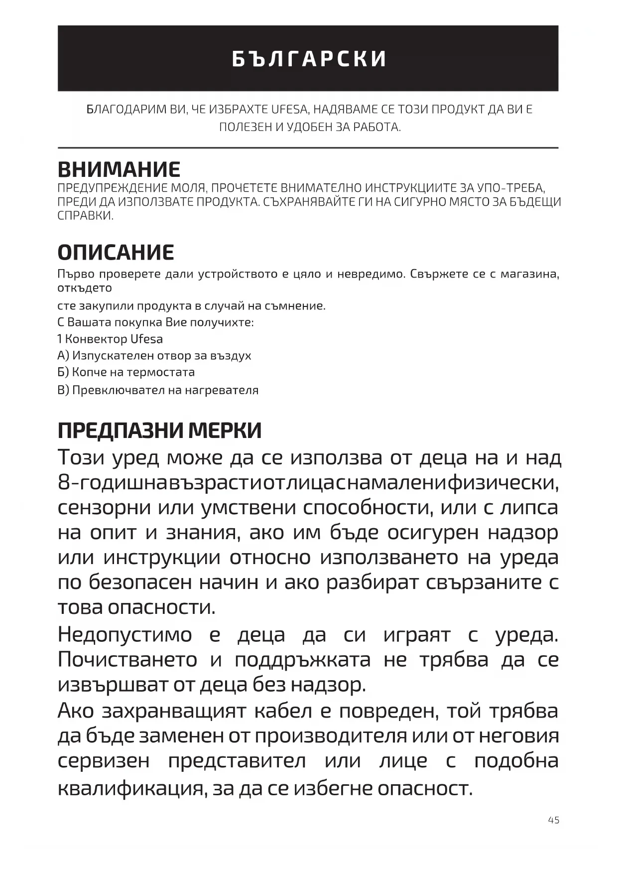 сте закупили продукта в случай на съмнение. С Вашата покупка Вие получихте: 1 Конвектор Ufesa А) Изпускателен отвор за въздух Б) Копче на термостата В) Превключвател на нагревателя ПРЕДПАЗНИ МЕРКИ Този уред може да се използва от деца на и над 8-годишна възраст и от лица с намалени физически, сензорни или умствени способности, или с липса на опит и знания, ако им бъде осигурен надзор или инструкции относно използването на уреда по безопасен начин и ако разбират свързаните с това опасности. Недопустимо е деца да си играят с уреда. Почистването и поддръжката не трябва да се извършват от деца без надзор. Ако захранващият кабел е повреден, той трябва да бъде заменен от производителя или от неговия сервизен представител или лице с подобна квалификация, за да се избегне опасност. БЪЛГАРСКИ46 ПРЕДУПРЕЖДЕНИЕ: За да избегнете прегряване, не покривайте нагревателя. Нагревателят не трябва да се намира непосредствено под контакта. Не използвайте този нагревател в непосредствена близост до вана, душ или плувен басейн. Не използвайте този нагревател, ако е бил изпуснат; Не използвайте, ако има видими признаци на повреда на нагревателя. Използвайте този нагревател върху хоризонтална и стабилна повърхност или го фиксирайте към стената, според случая. Деца под 3 години трябва да се държат далеч от уреда, освен ако не са под постоянно наблюдение. Деца на възраст от 3 години до 8 години трябва да включват/ изключват уреда само при условие, че той е бил поставен или инсталиран в предвиденото нормално работно положение и са били наблюдавани или инструктирани относно използването на уреда по безопасен начин и разбират свързаните с това опасности. Деца на възраст от 3 години до 8 години не трябва да включват, регулират и почистват уреда или да извършват потребителска поддръжка. Не използвайте този нагревател в малки стаи когато те са обитавани от хора, които не могат да напуснат стаята сами, освен ако не е осигурено постоянно наблюдение. За да намалите риска от пожар, дръжте текстил, завеси или друг запалим материал на минимално разстояние от 1 m от изхода на въздуха.47 ВНИМАНИЕ: Някои части на уреда могат да станат много горещи и да причинят изгаряния. Когато присъстват хора и уязвими лица, трябва да се обърне специално внимание. Този символ означава, че продуктът не трябва да се покрива. Този уред е предназначен за използване на максимална надморска височина от 2000 м над морското равнище. ВАЖНО ПРЕДУПРЕЖДЕНИЕ - Този уред е предназначен само за домашна употреба. - Преди да свържете продукта към електрическата мрежа, проверете дали напрежението на вашата мрежа е същото или е в границите, посочени на етикета на продукта. - Дръжте уреда далеч от деца и хора с увреждания. - Не местете уреда, докато го използвате. - Не оставяйте захранването включено ако няма да сте в същата стая, където е уредът. - Поддържайте уреда чист. Не допускайте никакви предмети във вентилационната система, тъй като това може да причини токов удар, пожар или да повреди уреда. -Не използвайте уреда за сушене на дрехи. - Винаги използвайте устройството в изправено положение. - Изключете уреда от контакта когато не го използвате. Не дърпайте кабела, за да изключите уреда. - Не използвайте устройството, ако е напукано или счупено. - Не използвайте уреда в помещения с площ под 4m2. - Уредът има система за сигурн