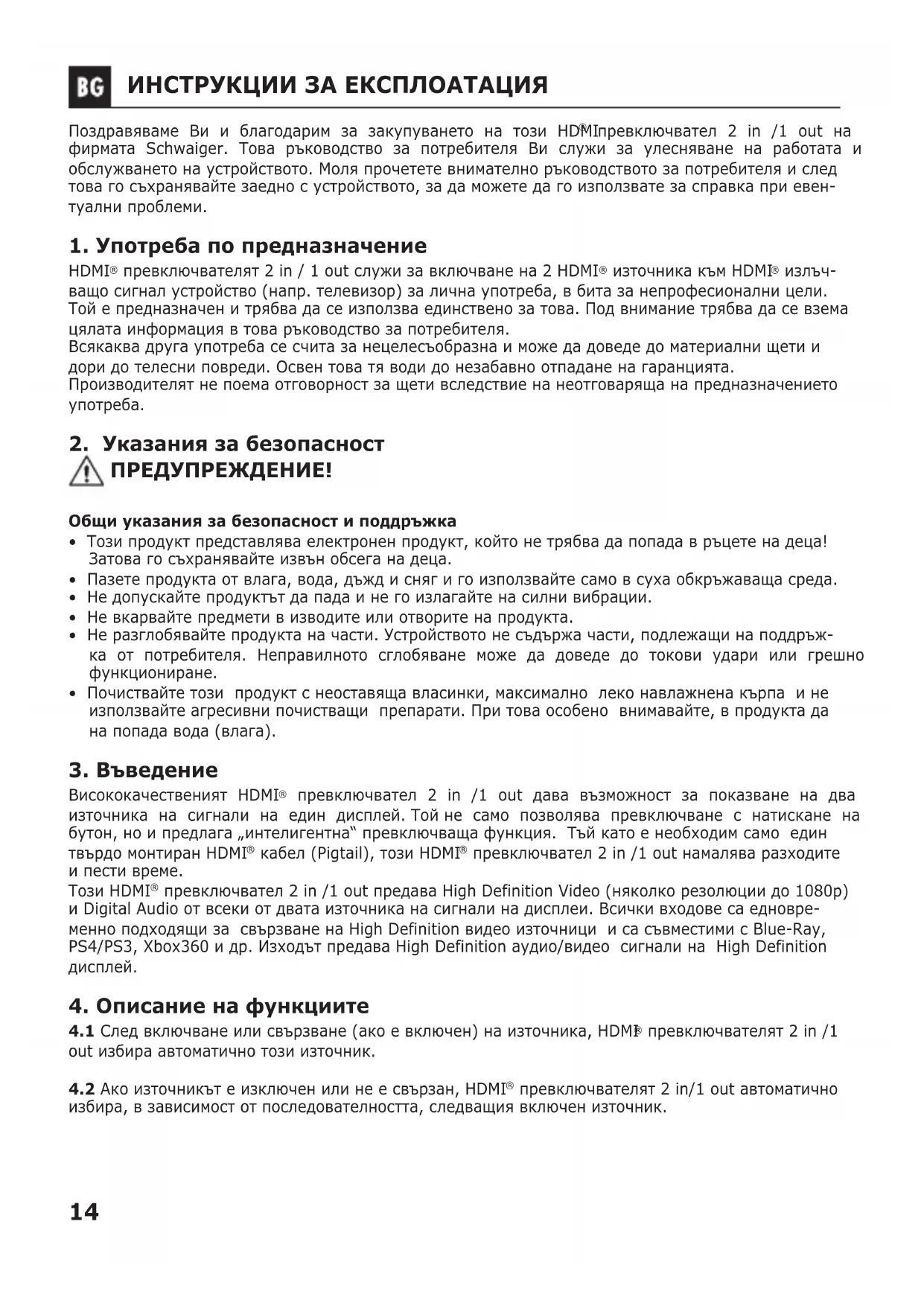 превключвател 2 in /1 out на фирмата Schwaiger. Това ръководство за потребителя Ви служи за улесняване на работата и обслужването на устройството. Моля прочетете внимателно ръководството за потребителя и след това го съхранявайте заедно с устройството, за да можете да го използвате за справка при евен- туални проблеми. 1.Употребапопредназначение HDMI
