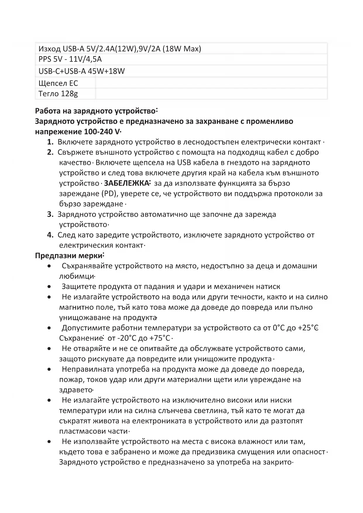 Зарядното устройство е предназначено за употреба на закрито .• Производителят не гарантира правилно PD