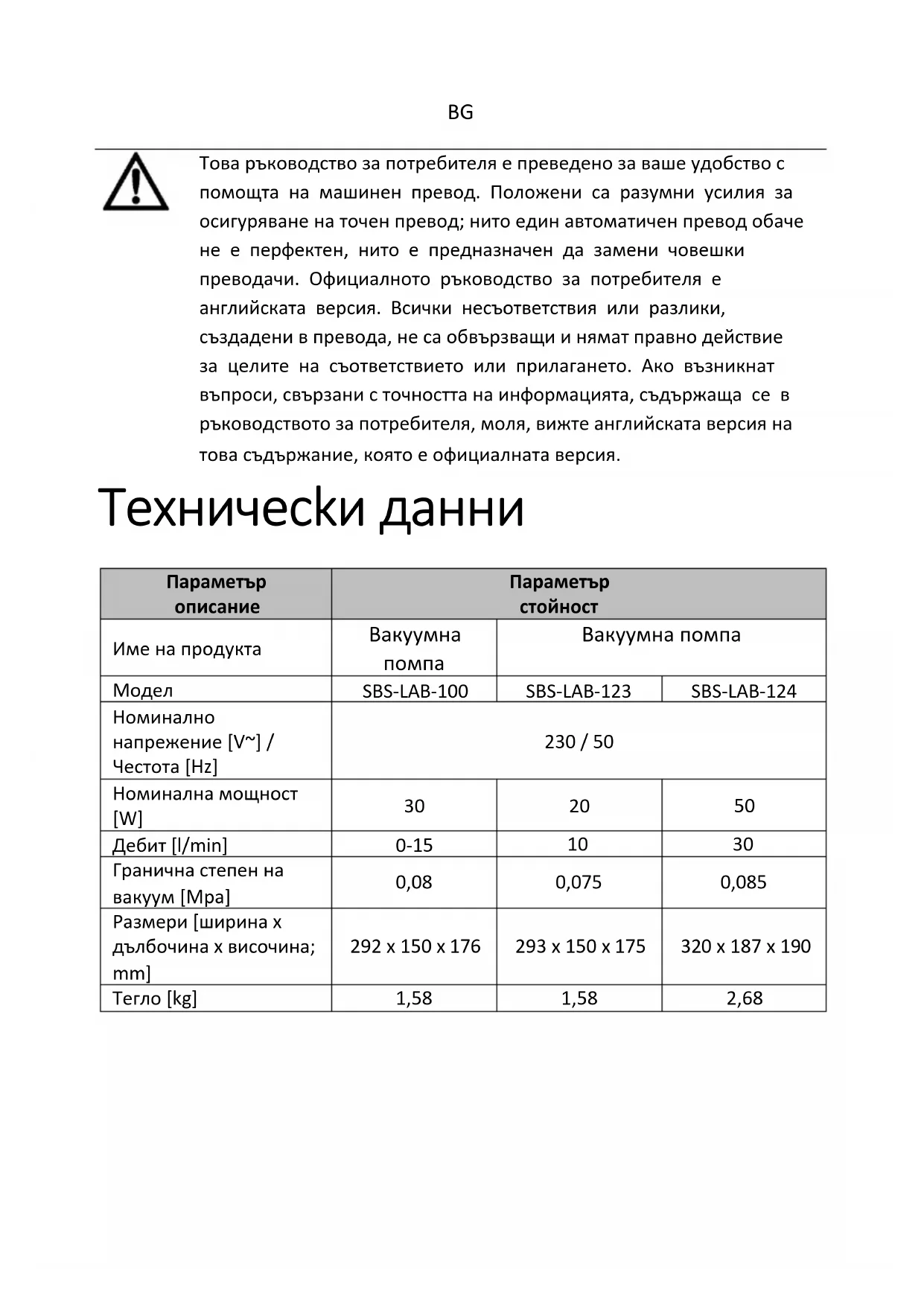 Гранична степен на вакуум [Mpa] 0,08 0,075 0,085 Размери [ширина x дълбочина x височина; mm] 292 x 150 x 176 293 x 150 x 175 320 x 187 x 190 Тегло [kg] 1,58 1,58 2,68BG