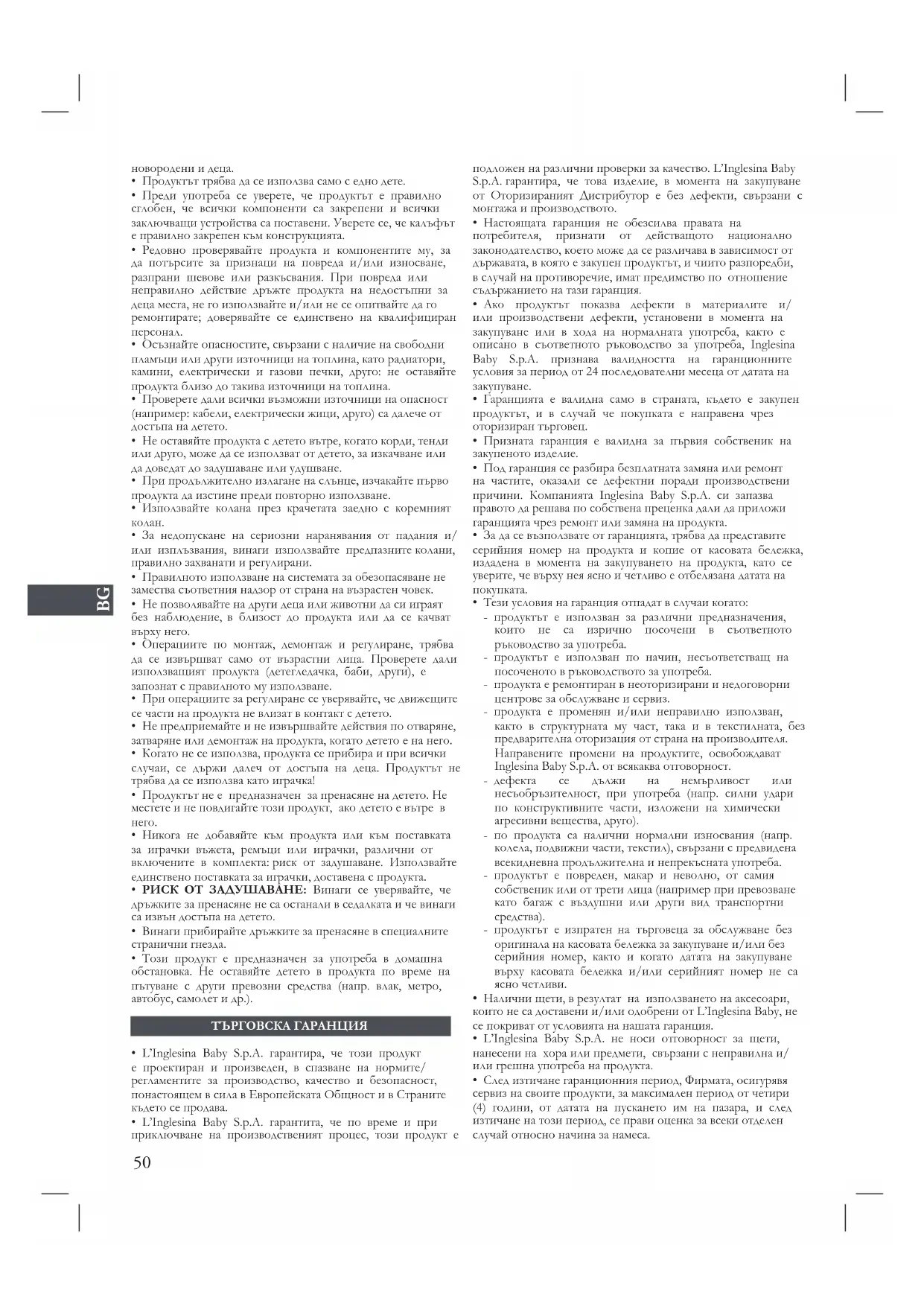 - L’Inglesina Baby S.p.A. гарантита, че по време и при приключване на производственият процес, този продукт е подложен на различни проверки за качество. L’Inglesina Baby S.p.A. гарантира, че това изделие, в момента на закупуване от Оторизираният Дистрибутор е без дефекти, свързани с монтажа и производството.