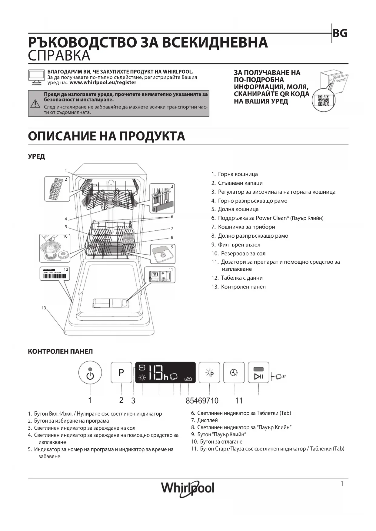 КОНТРОЛЕН ПАНЕЛ6. Светлинен индикатор за Таблетки (Tab)7. Дисплей8. Светлинен индикатор за “Пауър Клийн”9. Бутон “Пауър Клийн”10. Бутон за отлагане11. Бутон Старт/Пауза със светлинен индикатор / Таблетки (Tab) ОПИСАНИЕ НА ПРОДУКТА 1. Горна кошница2. Сгъваеми капаци3. Регулатор за височината на горната кошница4. Горно разпръскващо рамо5. Долна кошница6. Поддръжка за Power Clean® (Пауър Клийн)7. Кошничка за прибори8. Долно разпръскващо рамо9. Филтърен възел10. Резервоар за сол11. Дозатори за препарат и помощно средство за изплакване12. Табелка с данни13. Контролен панелБЛАГОДАРИМ ВИ, ЧЕ ЗАКУПИХТЕ ПРОДУКТ НА WHIRLPOOL. За да получавате по-пълно съдействие, регистрирайте Вашия уред на:: www.whirlpool.eu/registerПреди да използвате уреда, прочетете внимателно указанията за безопасност иинсталиране.След инсталиране не забравяйте да махнете всички транспортни час-ти от съдомиялната.ЗА ПОЛУЧАВАНЕ НА ПО-ПОДРОБНА ИНФОРМАЦИЯ, МОЛЯ, СКАНИРАЙТЕ QR КОДА НА ВАШИЯ УРЕД