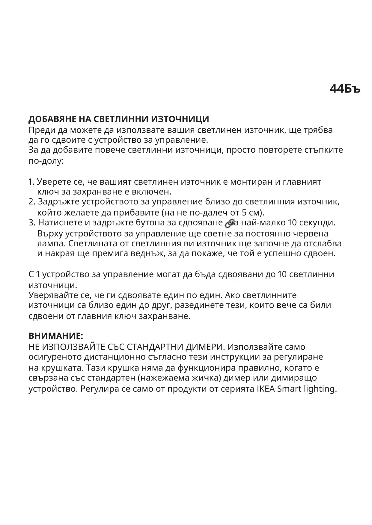 НЕ ИЗПОЛЗВАЙТЕ СЪС СТАНДАРТНИ ДИМЕРИ. Използвайте само осигуреното дистанционно съгласно тези инструкции за регулиране на крушката. Тази крушка няма да функционира правилно, когато е свързана със стандартен (нажежаема жичка) димер или димиращо устройство. Регулира се само от продукти от серията IKEA Smart lighting.45 ЗАНУЛЕТЕУСТРОЙСТВОТОСИ Изключете и включете главния ключ 6 пъти. ТЕХНИЧЕСКИДАННИ Вид: T2035 STOFTMOLN T2037 STOFTMOLN Входнонапрежение:220-240 VAC, 50/60Hz Обхват: 10 м на открито Заупотребасамовзакритипомещения Работначестота:2405-2480MHz Изходнонапрежение:10 dBm Производител:IKEAofSwedenAB Адрес:Box702,SE-34381Älmhult,SWEDEN Символът със задраскан кош за боклук означава, че артикулът следва да се изхвърли отделно от битовите отпадъци. Артикулът трябва да бъде предаден за рециклиране в съответствие с местните правила за изхвърляне на отпадъци. Като отделяте обозначените артикули от битовите отпадъци, вие спомагате за намаляването на количествата отпадъци, предавани в сметища или за изгаряне, и свеждате до минимум потенциалните отрицателни въздействия върху човешкото здраве и околната среда. Моля, обърнете се към магазин ИКЕА за повече информация.46Hrvatski DODAJIZVORSVJETLASVOJEMUREĐAJUZAUPRAVLJANJE Prije upotrebe izvora svjetla, izvor treba prvo povezati s uređajem za upravljanje. Za dodavanje više rasvjetnih tijela, ponoviti korake ispod: