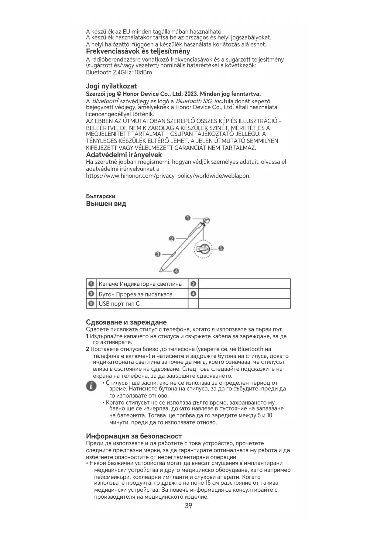 40Информация относно излагането на РЧ Този продукт е радиопредавател и приемник с ниска мощност, максималната му мощност е по-малка от границите за освобождаване oт оценка на специфичната степен на абсорбция (SAR), не се изисква изпитване за SAR. Той отговаря на приложимите национални и международни стандарти за излагане на радиовълни. Съответствие с регулаторните изисквания на ЕС С настоящото Honor Device Co., Ltd. декларира, че това устройство BTN- pen00 съответства на следната директива: RED 2014/53/ЕС, RoHS 2011/65/ ЕС. Целият текст на декларацията за съответствие на ЕС и най- скорошната информация относно аксесоарите и софтуера са налични на следния интернет адрес: https://www.hihonor.com/global/legal/ceication/. Това устройство може да работи във всички държави-членки на ЕС. Спазвайте националните и местни разпоредби там, където се използва устройството. Това устройство може да бъде ограничено за употреба, в зависимост от местната мрежа. Честотни ленти и захранване Номиналните граници на честотните ленти и мощността на предаване (излъчена и/или проведена), приложими за това радиооборудване, са