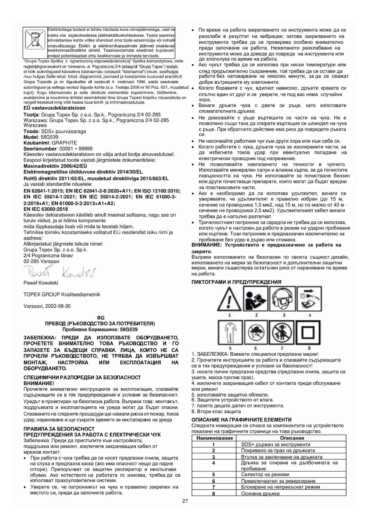 Захранваните с електричество продукти не трябва да се изхвърлят заедно с битовите отпадъци, а да се предават в подходящи съоръжения за изхвърляне. Свържете се с търговеца на продукта или с местните власти за информация относно изхвърлянето. Отпадъците от електрическо и електронно оборудване съдържат инертни за околната среда вещества. Оборудването, което не се рециклира, представлява потенциален риск за околната среда и човешкото здраве.29 "Grupa Topex Spółka z ograniczoną odpowiedzialnością" Spółka komandytowa със седалище във Варшава, ул. Pograniczna 2/4 (наричана по-нататък "Grupa Topex") информира, че всички авторски права върху съдържанието на това ръководство (наричано по-нататък "Ръководство"), включително, наред с другото. неговия текст, снимки, диаграми, чертежи, както и композицията му, принадлежат изключително на Grupa Topex и са обект на правна защита съгласно Закона от 4 февруари 1994 г. за авторското право и сродните му права (т.е. ДВ, бр. 90 от 2006 г., поз. 631, с измененията). Копирането, обработката, публикуването, модифицирането с търговска цел на цялото Ръководство и на отделните му елементи без съгласието на Grupa Topex, изразено в писмена форма, е строго забранено и може да доведе до гражданска и наказателна отговорност. ЕО декларация за съответствие Производител: Sp.k., Pograniczna 2/4 02-285 Warszawa Продукт: SDS+ бормашина Модел: 58G539 Търговско наименование: GRAPHITE Сериен номер: 00001 ÷ 99999 Настоящата декларация за съответствие се издава на пълната отговорност на производителя. Продуктът, описан по-горе, съответства на следните документи: Директива за машините 2006/42/ЕО Директива 2014/30/ЕС за електромагнитна съвместимост Директива 2011/65/ЕС, изменена с Директива 2015/863/ЕС И отговаря на изискванията на стандартите: EN 62841-1:2015; EN IEC 62841-2-6:2020+A11; EN ISO 12100:2010; EN IEC 55014-1:2021; EN IEC 55014-2:2021; EN IEC 61000-3- 2:2019+A1; EN 61000-3-3:2013+A1+A2; EN IEC 63000:2018 Настоящата декларация се отнася само за машината, както е пусната на пазара, и не включва компоненти. добавени от крайния потребител или извършени от него впоследствие. Име и адрес на лицето, пребиваващо в ЕС, упълномощено да изготви техническото досие: Подписано от името на: Grupa Topex Sp. z o.o. Sp.k. Улица Pograniczna 2/4 02-285 Варшава Павел Ковалски Отговорник по качеството на TOPEX GROUP Варшава, 2022-08-30