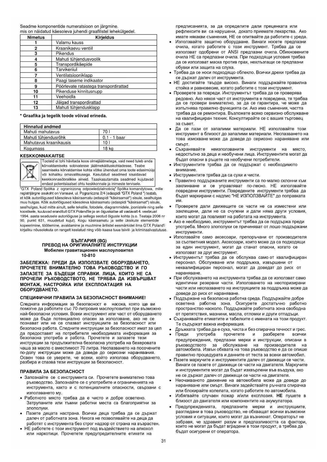 - Използвайте устройството по предназначение. Пиктограми и предупреждения 1.Прочетете внимателно инструкциите за експлоатация 2,.Носете предпазни очила и защитна маска 3.Wear защитно облекло 4.Wear защитни ръкавици 5.Wear маслоустойчиви и противохлъзгащи се обувки за безопасност 6.Keep на място, недостъпно за деца 7.Protect от влага 8.За употреба на закрито 9.Do не хвърляйте в огъня 10.Do не хвърляйте във вода 11.Не изхвърляйте заедно с битовите отпадъци 12.Подлежи на разделно събиране на отпадъци ОПИСАНИЕ НА ПРОДУКТА Мобилният гравитационен маслоуловител с капацитет 70 литра е предназначен за ефективно източване на използваното масло от автомобила. Устройството е снабдено с функция за самоотцеждане под налягане, която използва сгъстен въздух за източване на използваното масло от резервоара. СПЕЦИФИЧНИ ИНСТРУКЦИИ И ПРЕДУПРЕЖДЕНИЯ ЗА БЕЗОПАСНОСТ ПРЕДУПРЕЖДЕНИЕ: НЕ превишавайте максималното налягане в резервоара, посочено в спецификацията на продукта. Неспазването на това изискване може да доведе до повреда на продукта и да причини телесни повреди и/или материални щети. ПРЕДУПРЕЖДЕНИЕ: НЕ извършвайте никакви настройки на дренажа за масло, когато е свързан към вентилационната система или когато продуктът се използва. се използва. Неспазването на изискванията може да доведе до изтичане на масло и материални щети. ПРЕДУПРЕЖДЕНИЕ: НЕ използвайте този продукт за изпомпване на вода/бензин или други течности, за които той не е предназначен. ПРЕДУПРЕЖДЕНИЕ: Винаги изчаквайте двигателя да изстине, преди да източите маслото. Горещото масло може да причини тежки