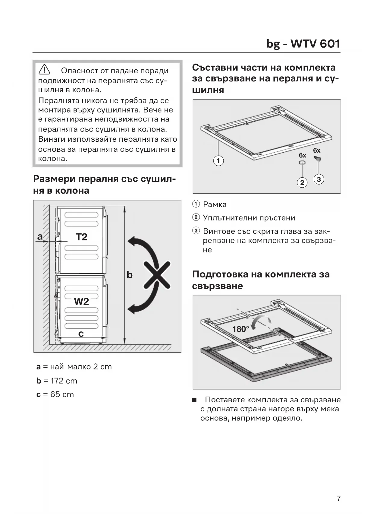 Fachleuten montieren. 6bg - WTV601 Опасност от падане поради подвижност на пералнята със су- шилня в колона. Пералнята никога не трябва да се монтира върху сушилнята. Вече не е гарантирана неподвижността на пералнята със сушилня в колона. Винаги използвайте пералнята като основа за пералнята със сушилня в