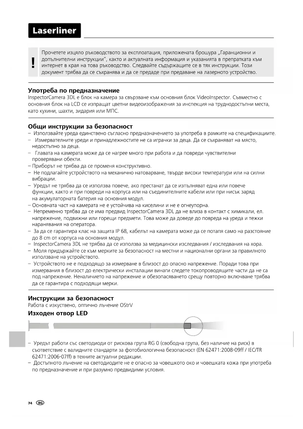 – Уредът не трябва да се използва повече, ако престанат да се изпълняват една или повече функции, както и при повреди на корпуса или на съединителните кабели или при нисък заряд на акумулаторната батерия на основния модул. – Основната част на камерата не е устойчива на киселини и не е огнеупорна. – Непременно трябва да се има предвид InspectorCamera 3DL да не влиза в контакт с химикали, ел. напрежение, подвижни или горещи предмети. Това може да доведе до повреда на уреда и тежки наранявания на оператора. – За да се гарантира клас на защита IP 68, кабелът на камерата може да се потапя само на разстояние до 8 cm от корпуса на основния модул. – InspectorCamera 3DL не трябва да се използва за медицински изследвания / изследвания на хора. – Моля придържайте се към мерките за безопасност на местни и национални органи за правилното използване на устройството. – Устройството не е подходящо за измерване в близост до опасно напрежение. Поради това при измервания в близост до електрически инсталации винаги следете токопроводящите части да не са под напрежение. Неналичието на напрежение и обезопасяването срещу повторно включване трябва да се гарантира с подходящи мерки. Употреба по предназначение InspectorCamera 3DL е блок на камера за свързване към основния блок VideoInspector. Съвместно с основния блок на LCD се изпращат цветни видеоизображения за инспекция на труднодостъпни места, като кухини, шахти, зидария или МПС. Прочетете изцяло ръководството за експлоатация, приложената брошура „Гаранционни и допълнителни инструкции“, както и актуалната информация и указанията в препратката към интернет в края на това ръководство. Следвайте съдържащите се в тях инструкции. Този документ трябва да се съхранява и да се предаде при предаване на лазерното устройство. !InspectorCamera 3DL