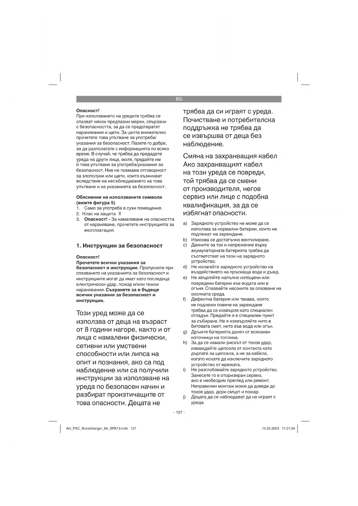 Ускорен режим Зарядното устройство е в ускорен режим Гор е посочения статус на индикацията на червен+зелен светодиод важи и тук. Anl_PXC_Boostcharger_8A_SPK13.indb 130Anl_PXC_Boostcharger_8A_SPK13.indb 130 15.02.2023 11:21:0515.02.2023 11:21:05BG