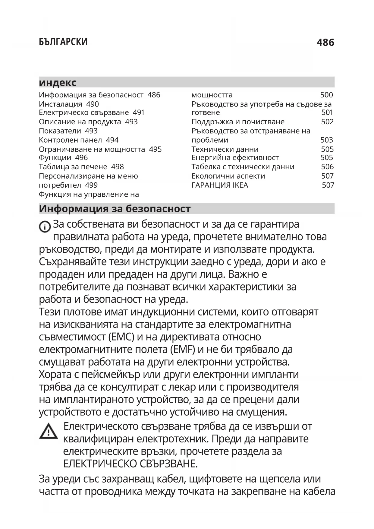 Информациязабезопасност За собствената ви безопасност и за да се гарантира правилната работа на уреда, прочетете внимателно това ръководство, преди да монтирате и използвате продукта. Съхранявайте тези инструкции заедно с уреда, дори и ако е продаден или предаден на други лица. Важно е потребителите да познават всички характеристики за работа и безопасност на уреда. Тези плотове имат индукционни системи, които отговарят на изискванията на стандартите за електромагнитна съвместимост (EMC) и на директивата относно електромагнитните полета (EMF) и не би трябвало да смущават работата на други електронни устройства. Хората с пейсмейкър или други електронни импланти трябва да се консултират с лекар или с производителя на имплантираното устройство, за да се прецени дали устройството е достатъчно устойчиво на смущения. Електрическото свързване трябва да се извърши от квалифициран електротехник. Преди да направите електрическите връзки, прочетете раздела за ЕЛЕКТРИЧЕСКО СВЪРЗВАНЕ. За уреди със захранващ кабел, щифтовете на щепсела или частта от проводника между точката на закрепване на кабела Информация за безопасност 486 Инсталация 490 Електрическо свързване 491 Описание на продукта 493 Показатели 493 Контролен панел 494 Ограничаване на мощността 495 Функции 496 Таблица за печене 498 Персонализиране на меню потребител 499 Функция на управление на мощността 500 Ръководство за употреба на съдове за готвене 501 Поддръжка и почистване 502 Ръководство за отстраняване на проблеми 503 Технически данни 505 Енергийна ефективност 505 Табелка с технически данни 506 Екологични аспекти 507 ГАРАНЦИЯ IKEA 507487