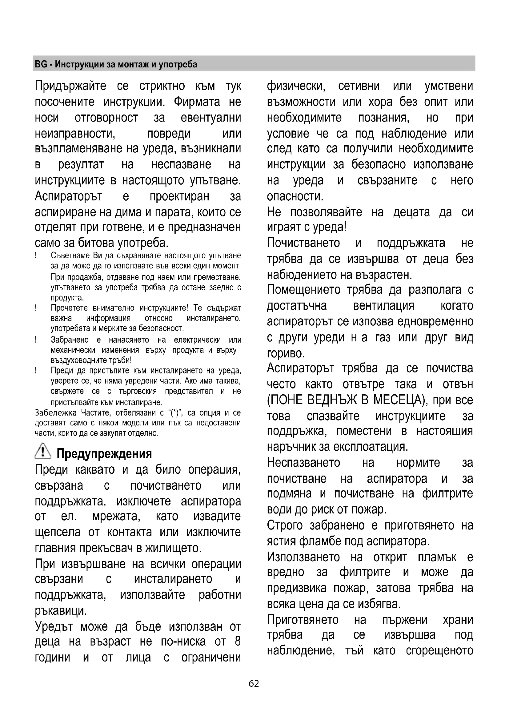 Не позволявайте на децата да си играят с уреда! Почистването и поддръжката не трябва да се извършва от деца без набюдението на възрастен. Помещението трябва да разполага с достатъчна вентилация когато аспираторът се изпозва едновременно с други уреди н а газ или друг вид
