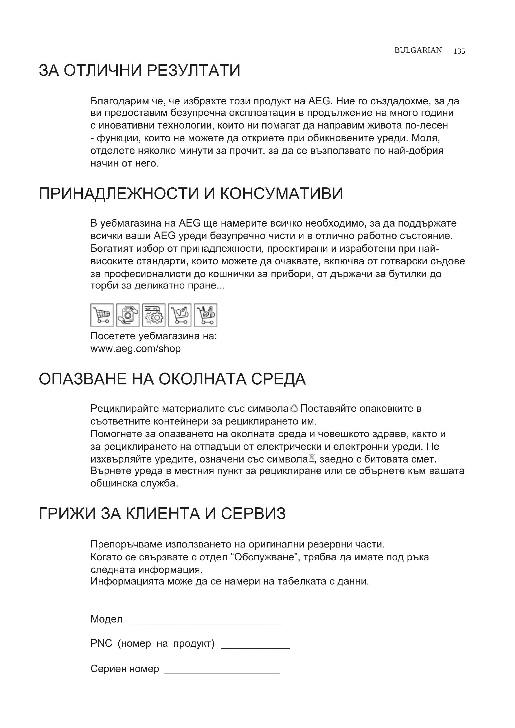 - Değiştirmek için Teknik Servisle bağlantı kurun ("Edinmek için teknik servisle bağlantı kurun").135 BULGARIAN ЗА ОТЛИЧНИ РЕЗУЛТАТИ Благодарим че, че избрахте този продукт на AEG. Ние го създадохме, за да ви предоставим безупречна експлоатация в продължение на много години с иновативни технологии, които ни помагат да направим живота по-лесен - функции, които не можете да откриете при обикновените уреди. Моля, отделете няколко минути за прочит, за да се възползвате по най-добрия начин от него. ПРИНАДЛЕЖНОСТИ И КОНСУМАТИВИ В уебмагазина на AEG ще намерите всичко необходимо, за да поддържате всички ваши AEG уреди безупречно чисти и в отлично работно състояние. Богатият избор от принадлежности, проектирани и изработени при най- високите стандарти, които можете да очаквате, включва от готварски съдове за професионалисти до кошнички за прибори, от държачи за бутилки до торби за деликатно пране... Посетете уебмагазина на: www.aeg.com/shop ОПАЗВАНЕ НА ОКОЛНАТА СРЕДА Рециклирайте материалите със символа . Поставяйте опаковките в съответните контейнери за рециклирането им. Помогнете за опазването на околната среда и човешкото здраве, както и за рециклирането на отпадъци от електрически и електронни уреди. Не изхвърляйте уредите, означени със символа , заедно с битовата смет. Върнете уреда в местния пункт за рециклиране или се обърнете към вашата общинска служба. ГРИЖИ ЗА КЛИЕНТА И СЕРВИЗ Препоръчваме използването на оригинални резервни части. Когато се свързвате с отдел “Обслужване”, трябва да имате под ръка следната информация. Информацията може да се намери на табелката с данни. Модел __________________________ PNC (номер на продукт) ____________ Сериен номер ____________________136 www.aeg.com