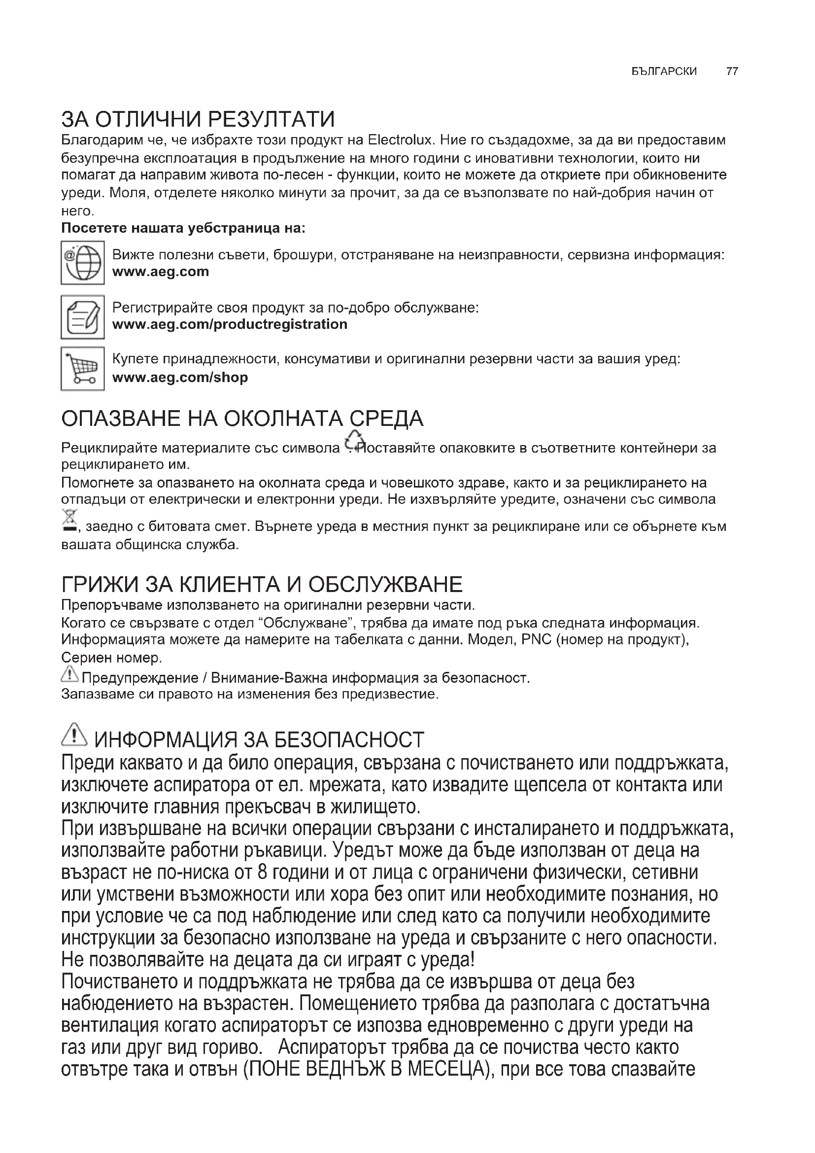 Посетете нашата уебстраница на: Вижте полезни съвети, брошури, отстраняване на неизправности, сервизна информация: www.aeg.com Регистрирайте своя продукт за по-добро обслужване: www.aeg.com/productregistration Купете принадлежности, консумативи и оригинални резервни части за вашия уред: www.aeg.com/shop ОПАЗВАНЕ НА ОКОЛНАТА СРЕДА Рециклирайте материалите със символа . Поставяйте опаковките в съответните контейнери за рециклирането им. Помогнете за опазването на околната среда и човешкото здраве, както и за рециклирането на отпадъци от електрически и електронни уреди. Не изхвърляйте уредите, означени със символа , заедно с битовата смет. Върнете уреда в местния пункт за рециклиране или се обърнете към вашата общинска служба. ГРИЖИ ЗА КЛИЕНТА И ОБСЛУЖВАНЕ Препоръчваме използването на оригинални резервни части. Когато се свързвате с отдел “Обслужване”, трябва да имате под ръка следната информация. Информацията можете да намерите на табелката с данни. Модел, PNC (номер на продукт), Сериен номер. Предупреждение / Внимание-Важна информация за безопасност. Запазваме си правото на изменения без предизвестие. ИНФОРМАЦИЯ ЗА БЕЗОПАСНОСТ Преди каквато и да било операция, свързана с почистването или поддръжката, изключете аспиратора от ел. мрежата, като извадите щепсела от контакта или изключите главния прекъсвач в жилището. При извършване на всички операции свързани с инсталирането и поддръжката, използвайте работни ръкавици. Уредът може да бъде използван от деца на възраст не по-ниска от 8 години и от лица с ограничени физически, сетивни или умствени възможности или хора без опит или необходимите познания, но при условие че са под наблюдение или след като са получили необходимите инструкции за безопасно използване на уреда и свързаните с него опасности. Не позволявайте на децата да си играят с уреда! Почистването и поддръжката не трябва да се извършва от деца без набюдението на възрастен. Помещението трябва да разполага с достатъчна вентилация когато аспираторът се изпозва едновременно с други уреди на газ или друг вид гориво. Аспираторът трябва да се почиства често както отвътре така и отвън (ПОНЕ ВЕДНЪЖ В МЕСЕЦА), при все това спазвайте