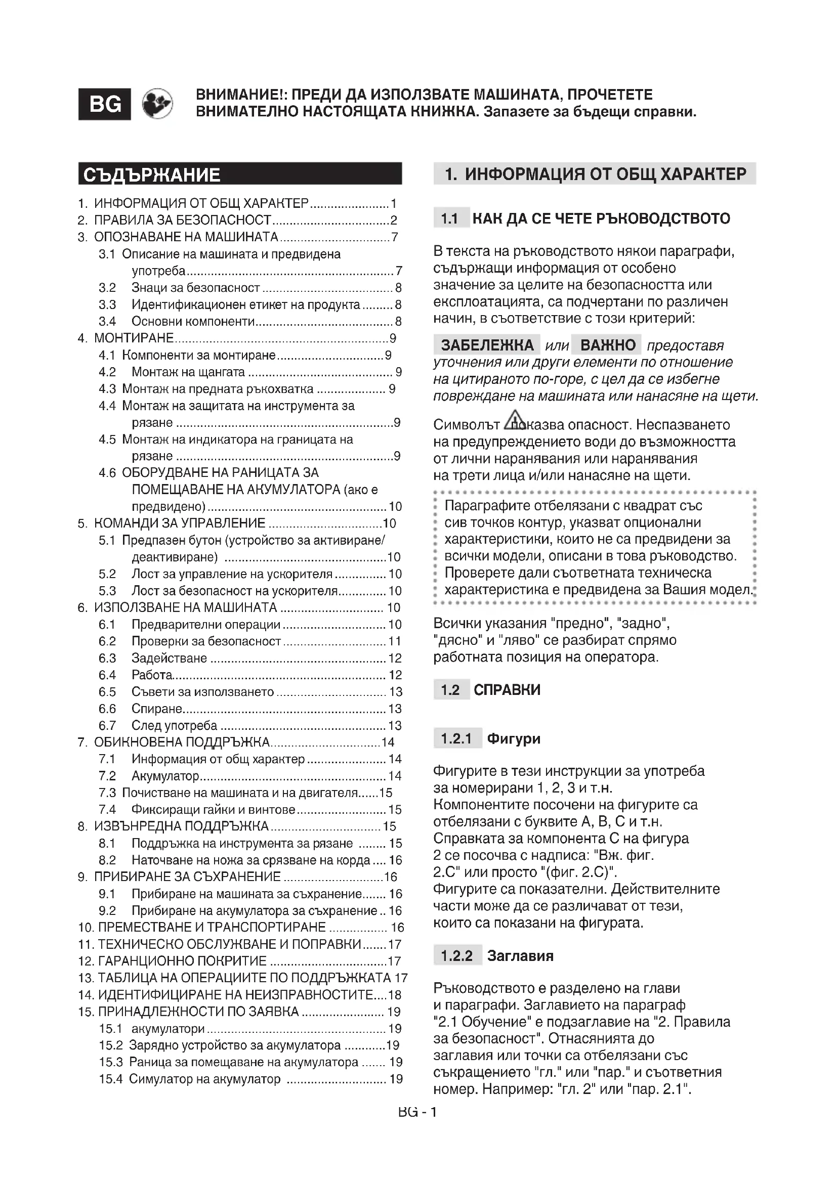 Ръководството е разделено на глави и параграфи. Заглавието на параграф "2.1 Обучение" е подзаглавие на "2. Правила за безопасност". Отнасянията до заглавия или точки са отбелязани със съкращението "гл." или "пар." и съответния номер. Например: "гл. 2" или "пар. 2.1".