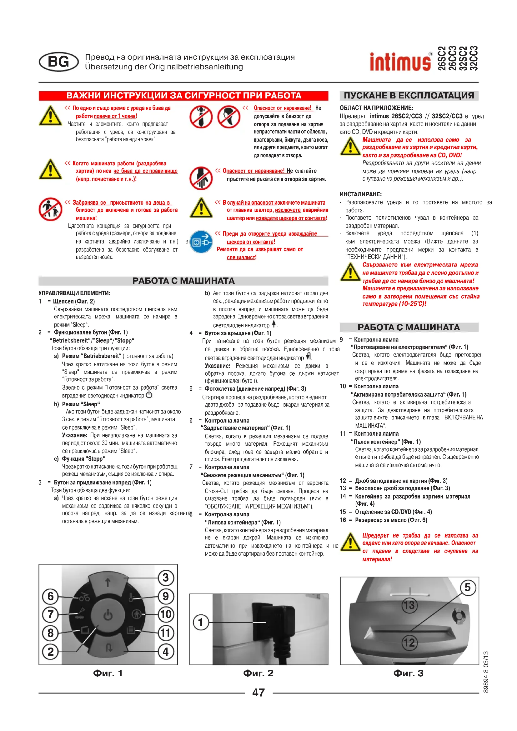 89894 8 03/13 Модел Данни за захранване от мрежата захранващонапрежение/честота•потреблениенаел.енергия•мощност intimus 26SC2 220-240V/50Hz•1,7A•0,39kW 120V/60Hz•2,9A•0,35kW intimus 26CC3 220-240V/50Hz•1,7A•0,39kW 120V/60Hz•2,9A•0,35kW intimus 32SC2 220-240V/50Hz•1,9A•0,44kW 120V/60Hz•3,5A•0,42kW intimus 32CC3 220-240V/50Hz•1,9A•0,44kW 120V/60Hz•3,5A•0,42kW Модел Ширина на рязане Производителност при рязане Работна ширина Ниво на шума Прекъсвана работа Размери Тегло хартия/CD,DVD хартия/CD,DVD ВКЛ./ИЗКЛ. ШxДxВ intimus 26SC2 276-4S 4мм/8мм 13листа*/1брой 240мм ок.55dB(A) 10/45мин 390x330x550мм 16кг intimus 26CC3 276-4C 4x28мм/8мм 9листа*/1брой 240мм ок.55dB(A) 10/45мин 390x330x550мм 16,2кг intimus 32SC2 277-4S 4мм/8мм 17листа*/1брой 240мм ок.55dB(A) 10/45мин 390x360x600мм 16,5кг intimus 32CC3 277-4C 4x28мм/8мм 12листа*/1брой 240мм ок.55dB(A) 10/45мин 390x360x600мм 16,7кг Режещият механизъм започва автоматично цикъла на почистване (движение напред/назад) и след това изключва. Машинатаотновоеготовазаработа.Вслучайнапоследваща поръчка на специално масло виж в “ДОПЪЛНИТЕЛНИ ПРИНАДЛЕЖНОСТИ“.АВТОМАТИКА ЗА ПЕСТЕНЕ НА ЕНЕРГИЯ:Акомашината несе използваизвестновреме,следоколо 30мин. тя автоматично се превключва в така наречения режим“Sleep“.Светодиодниятиндикатор нафункционалниябутон (2) за “Готовност за работа“ изгасва. За включване отново натиснете за кратко функционалния бутон. Ако е включенапотребителскатазащита,същататрябвадабъдедеактивиранаприповторнотовключваненамашината(вижвъв“ВКЛЮЧВАНЕНАМАШИНАТА“).ИЗХВЪРЛЯНЕ НА МАШИНАТА: След изтичането на експлоатационния период на машината се погрижете тя да бъде предадена за вторични суровини така, че да не замърсява околнатасреда.Неизхвърляйтечастиотмашината илиопаковкатайпридомакинскитеотпадъци.ПОЧИСТВАНЕ НА ФОТОКЛЕТКИТЕ (Фиг. 5): Ако във входния отвор останат частици хартия (напр. след задръстване с хартия) е възможно, уреда да не се изключвазаради“скритите“фотоклетки. Можете да отстраните хартиените парченца, съотв. да почиститефотоклетката,катоподадетеврежещиямеханизъм нов лист хартия или да включите машината на движение на заден ход и с четка да почистите кратко двете “очи“ на фотоклетката.ОБСЛУЖВАНЕ НА РЕЖЕЩИЯ МЕХАНИЗЪМ (CROSS-CUT):Cross-Cut-режещите механизми трябва да бъдат смазванипрезопределенпериоднаексплоатация.Акосветнеконтролнаталампа (7),процедирайтепоследнияначин:Извадете контейнеразараздробения материал (14),свалете резервоаразамасло(16)(Фиг.6)отдържачавдолнатачасти отновопоставетеконтейнера. Върху лист хартия разпределете малко масло и подайте същияпрезджобазаподаваненахартията(12)къмрежещия Хартиятасепоемаипотозиначинмаслотопопадаврежещия механизъм.Указание: За да изгасне индикатора е необходимо след процеса на смазване на режещия механизъм, този процес да бъде потвърден както следва:- Изтеглетеконтейнеразараздробенияматериал(14),докатосветнеконтролнаталампа (8).- Контролнителампи (7)и (4)мигат.- Натиснете бутона за връщане (4) и го задръжте, докатоугаснеконтролнаталампа (7).- Поставетеотновоконтейнера.