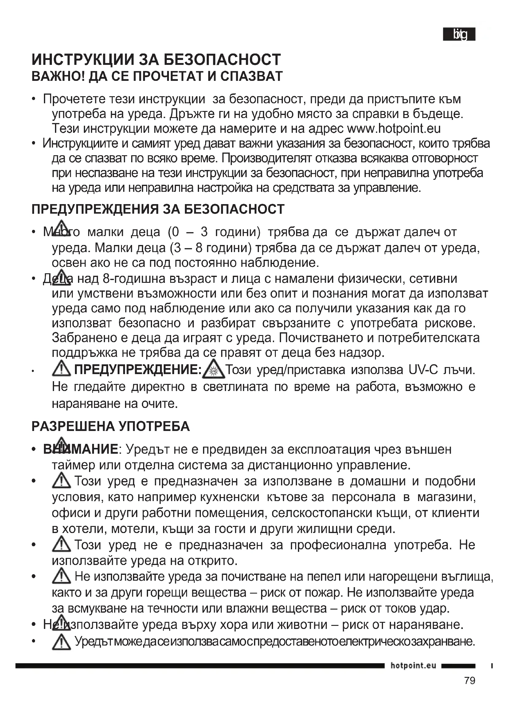 - Прочетете тези инструкции за безопасност, преди да пристъпите към употреба на уреда. Дръжте ги на удобно място за справки в бъдеще. Тези инструкции можете да намерите и на адрес www.hotpoint.eu