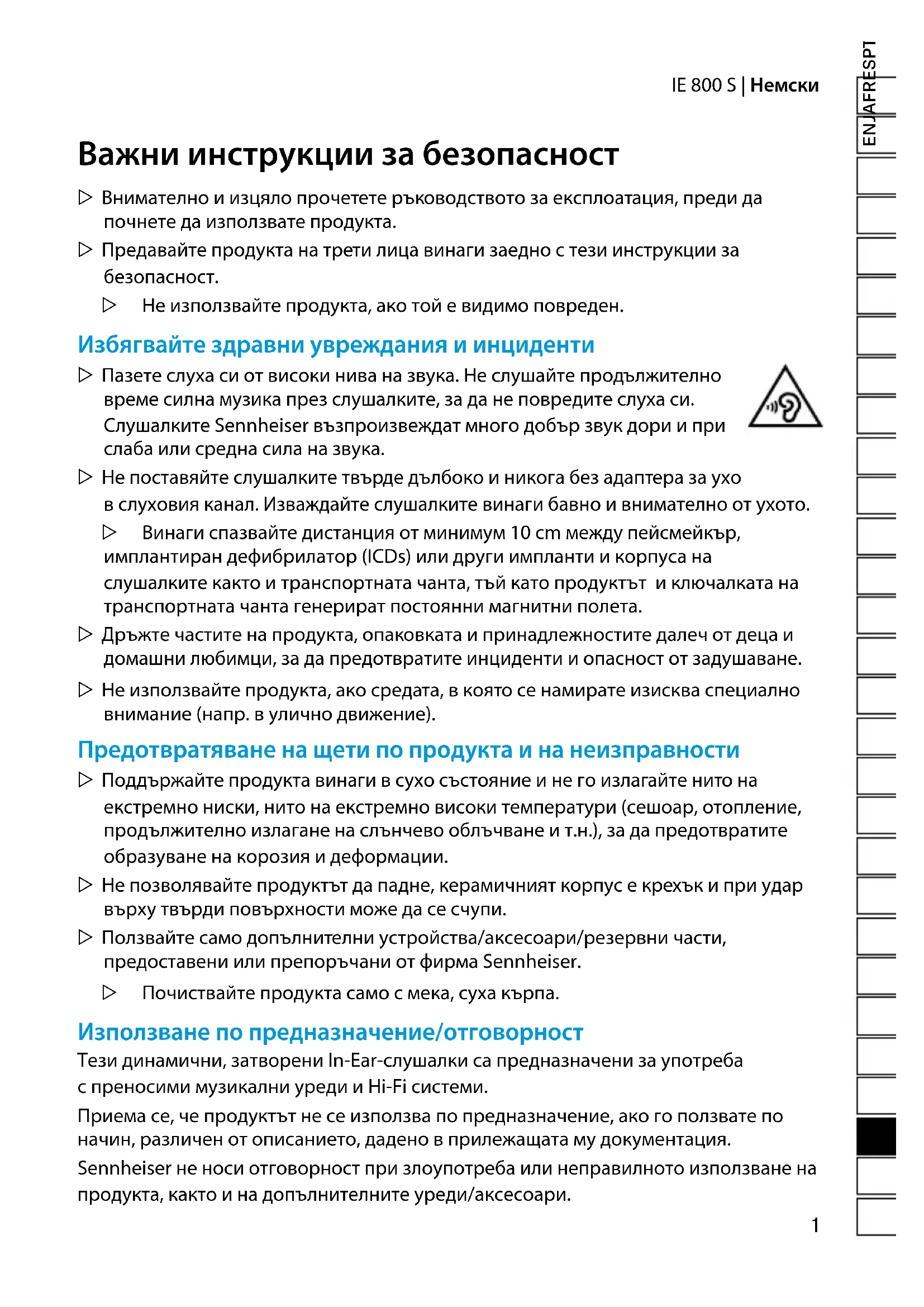 - Directiva DEEE (2012/19/UE) Simbolul tomberonului barat aplicat pe produs, baterie/acumulator (dacă este cazul) și/sau ambalaj indică faptul că la finalul duratei de utilizare aceste produse nu trebuie eliminate împreună cu deșeurile menajere obișnuite, ci în mod separat. Pentru ambalaje, vă rugăm să respectați cerințele legale pentru sortarea deșeurilor în țara dumneavoastră. Mai multe informații cu privire la modul de reciclare a acestor produse puteți obține de la administrația locală, centrele locale de colectare și reciclare a deșeurilor sau la partenerii dumneavoastră Sennheiser. Colectarea separată a deșeurilor electrice și electronice, a bateriilor/ acumulatorilor (dacă este cazul) și ambalajelor servește la stimularea procesului de reutilizate și/sau revalorificare și la evitarea efectelor negative, de exemplu cele provocate de eventualele substanțe nocive conținute. Procedând în acest mod, contribuiți în mod semnificativ la protecția mediului înconjurător și a sănătății.1 IE 800 S | Немски ENJAFRESPTNLITDASVFIELPLTRRUZHTWKOIDEELVLTCSSKHUROBGSLHR DE Важни инструкции за безопасност ▷ Внимателно и изцяло прочетете ръководството за експлоатация, преди да почнете да използвате продукта. ▷ Предавайте продукта на трети лица винаги заедно с тези инструкции за безопасност. ▷ Не използвайте продукта, ако той е видимо повреден. Избягвайте здравни увреждания и инциденти ▷ Пазете слуха си от високи нива на звука. Не слушайте продължително време силна музика през слушалките, за да не повредите слуха си. Слушалките Sennheiser възпроизвеждат много добър звук дори и при слаба или средна сила на звука. ▷ Не поставяйте слушалките твърде дълбоко и никога без адаптера за ухо в слуховия канал. Изваждайте слушалките винаги бавно и внимателно от ухото. ▷ Винаги спазвайте дистанция от минимум 10 cm между пейсмейкър, имплантиран дефибрилатор (ICDs) или други импланти и корпуса на слушалките както и транспортната чанта, тъй като продуктът и ключалката на транспортната чанта генерират постоянни магнитни полета. ▷ Дръжте частите на продукта, опаковката и принадлежностите далеч от деца и домашни любимци, за да предотвратите инциденти и опасност от задушаване. ▷ Не използвайте продукта, ако средата, в която се намирате изисква специално внимание (напр. в улично движение). Предотвратяване на щети по продукта и на неизправности ▷ Поддържайте продукта винаги в сухо състояние и не го излагайте нито на екстремно ниски, нито на екстремно високи температури (сешоар, отопление, продължително излагане на слънчево облъчване и т.н.), за да предотвратите образуване на корозия и деформации. ▷ Не позволявайте продуктът да падне, керамичният корпус е крехък и при удар върху твърди повърхности може да се счупи. ▷ Ползвайте само допълнителни устройства/аксесоари/резервни части, предоставени или препоръчани от фирма Sennheiser. ▷ Почиствайте продукта само с мека, суха кърпа. Използване по предназначение/отговорност Тези динамични, затворени In-Ear-слушалки са предназначени за употреба с преносими музикални уреди и Hi-Fi системи. Приема се, че продуктът не се използва по предназначение, ако го ползвате по начин, различен от описанието, дадено в прилежащата му документация. Sennheiser не носи отговорност при злоупотреба или неправилното използване на продукта, както и на допълнителните уреди/аксесоари. BG Ръководство за обслужване2 Немски | IE 800 S Обем на доставката 1 Слушалки тапи IE 800 S, дължина на кабел ок. 0,25 m Свързващ кабел 1 2,5 mm стерео жак, симетричен, дължина ок. 1 m 1 3,5 mm стерео жак, дължина ок. 1 m 1 4,4 mm Pentaconn стерео жак, симетричен, дължина ок. 1,1 m Адаптер за ухо (по двойки): 3 силикон, размер S, M (поставен на слушалките при доставка) и L 3 Comply™, размери S, M и L 1 Ръководство за експлоатация 1 Транспортна чанта 1 Микрофибърна кърпа Ваши IE 800 S