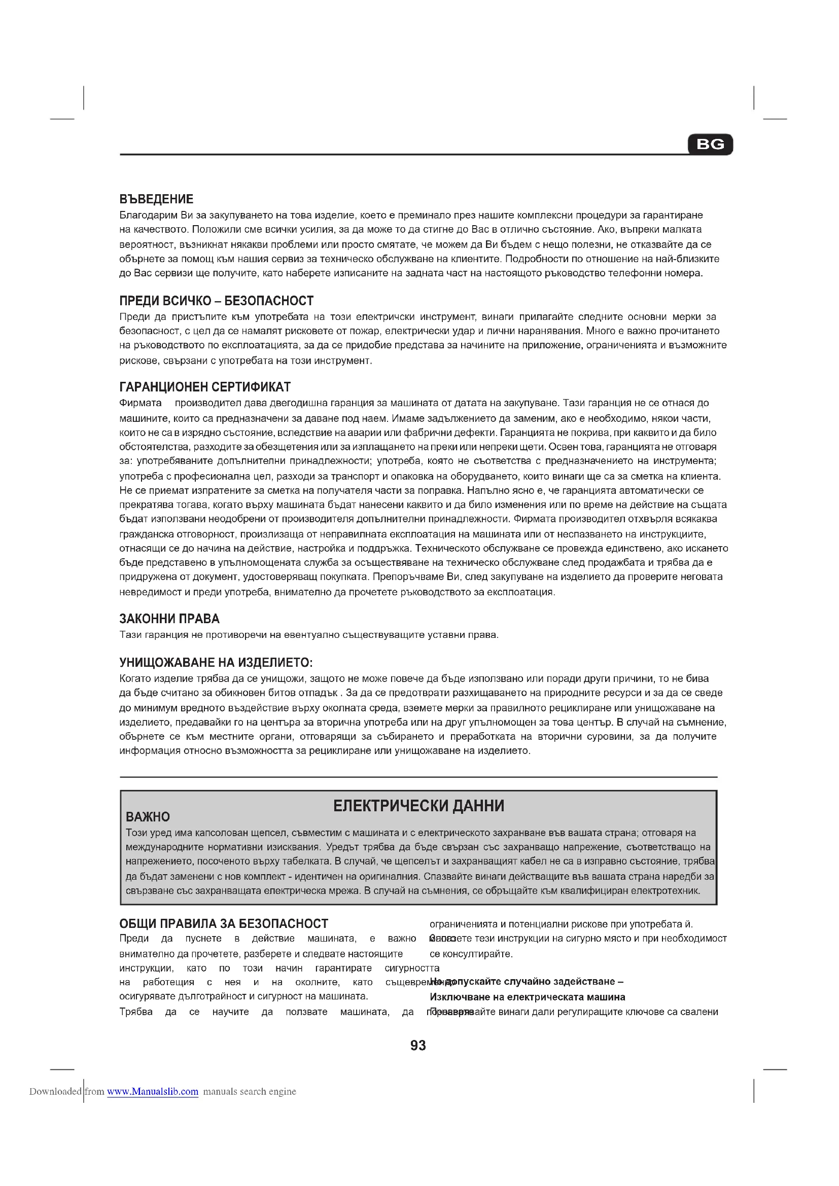 БлагодаримВизазакупуванетонатоваизделие,коетоепреминалопрезнaшитекомплекснипроцедуризагарантиране накачеството.Положилисмевсичкиусилия,задаможетодастигнедоВасвотличносъстояние.Ако,въпрекималката вероятност,възникнатнякаквипроблемиилипростосмятате,чеможемдаВибъдемснещополезни,неотказвайтедасе обърнетезапомощкъмнашиясервиззатехническообслужваненаклиентите.Подробностипоотношениенанай-близките доВассервизищеполучите,катонаберетеизписанитеназаднатачастнанастоящоторъководствотелефонниномера. ПРЕДИ ВСИЧКО – БЕЗОПАСНОСТ Преди да пристъпите към употребата на този електричски инструмент, винаги прилагайте следните основни мерки за безопасност,сцелдасенамалятрисковетеотпожар,електрическиудариличнинаранявания.Многоеважнопрочитането наръководствотопоексплоатацията,задасепридобиепредставазаначинитенаприложение,ограничениятаивъзможните рискове,свързанисупотребатанатозиинструмент. ГАРАНЦИОНЕН СЕРТИФИКАТ Фирмата производителдавадвегодишнагаранциязамашинатаотдататаназакупуване.Тазигаранциянесеотнасядо машините,коитосапредназначенизадаванеподнаем.Имамезадължениетодазаменим,акоенеобходимо,някоичасти, коитонесавизрядносъстояние,вследствиенааварииилифабричнидефекти.Гаранциятанепокрива,прикаквитоидабило обстоятелства,разходитезаобезщетенияилизаизплащанетонапрекиилинепрекищети.Освентова,гаранциятанеотговаря за: употребяванитедопълнителни принадлежности; употреба,която не съответства с предназначението на инструмента; употребаспрофесионалнацел,разходизатранспортиопаковканаоборудването,коитовинагищесазасметканаклиента. Несеприематизпратенитезасметканаполучателячастизапоправка.Напълноясное,чегаранциятаавтоматическисе прекратяватогава,когатовърхумашинатабъдатнанесеникаквитоидабилоизмененияилиповременадействиенасъщата бъдатизползванинеодобрениотпроизводителядопълнителнипринадлежности.Фирматапроизводителотхвърлявсякаква гражданскаотговорност,произлизащаотнеправилнатаексплоатациянамашинатаилиотнеспазванетонаинструкциите, отнасящиседоначинанадействие,настройкаиподдръжка.Техническотообслужванесепровеждаединствено,акоискането бъдепредставеновупълномощенатаслужбазаосъществяваненатехническообслужванеследпродажбатаитрябвадае придруженаотдокумент,удостоверяващпокупката.ПрепоръчвамеВи,следзакупуваненаизделиетодапроверитенеговата невредимостипредиупотреба,внимателнодапрочететеръководствотозаексплоатация. ЗАКОННИ ПРАВА Тазигаранциянепротиворечинаевентуалносъществуващитеуставниправа. УНИЩОЖАВАНЕ НА ИЗДЕЛИЕТО: Когатоизделиетрябвадасеунищожи,защотонеможеповечедабъдеизползваноилипорадидругипричини,тонебива дабъдесчитанозаобикновенбитовотпадък.Задасепредотвратиразхищаванетонаприроднитересурсиизадасесведе доминимумвреднотовъздействиевърхуоколнатасреда,вземетемеркизаправилноторециклиранеилиунищожаванена изделието,предавайкигонацентъразавторичнаупотребаилинадругупълномощензатовацентър.Вслучайнасъмнение, обърнете се към местните органи, отговарящи за събирането и преработката на вторични суровини, за да получите информацияотносновъзможносттазарециклиранеилиунищожаваненаизделието. Downloaded from www.Manualslib.com manuals search engine94