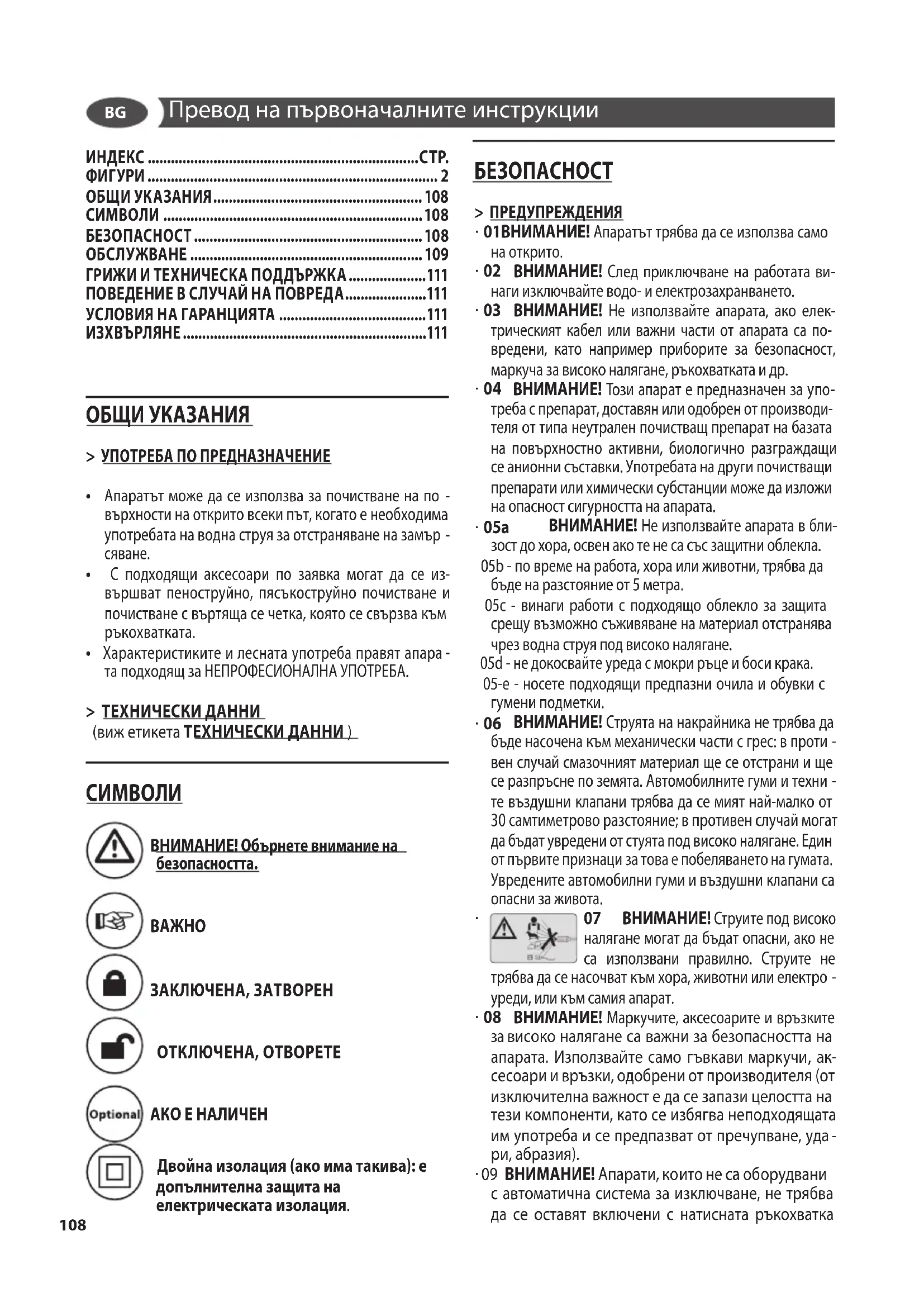 - 03 ВНИМАНИЕ! Не използвайте апарата, ако елек- трическият кабел или важни части от апарата са по- вредени, като например приборите за безопасност, маркуча за високо налягане, ръкохватката и др.