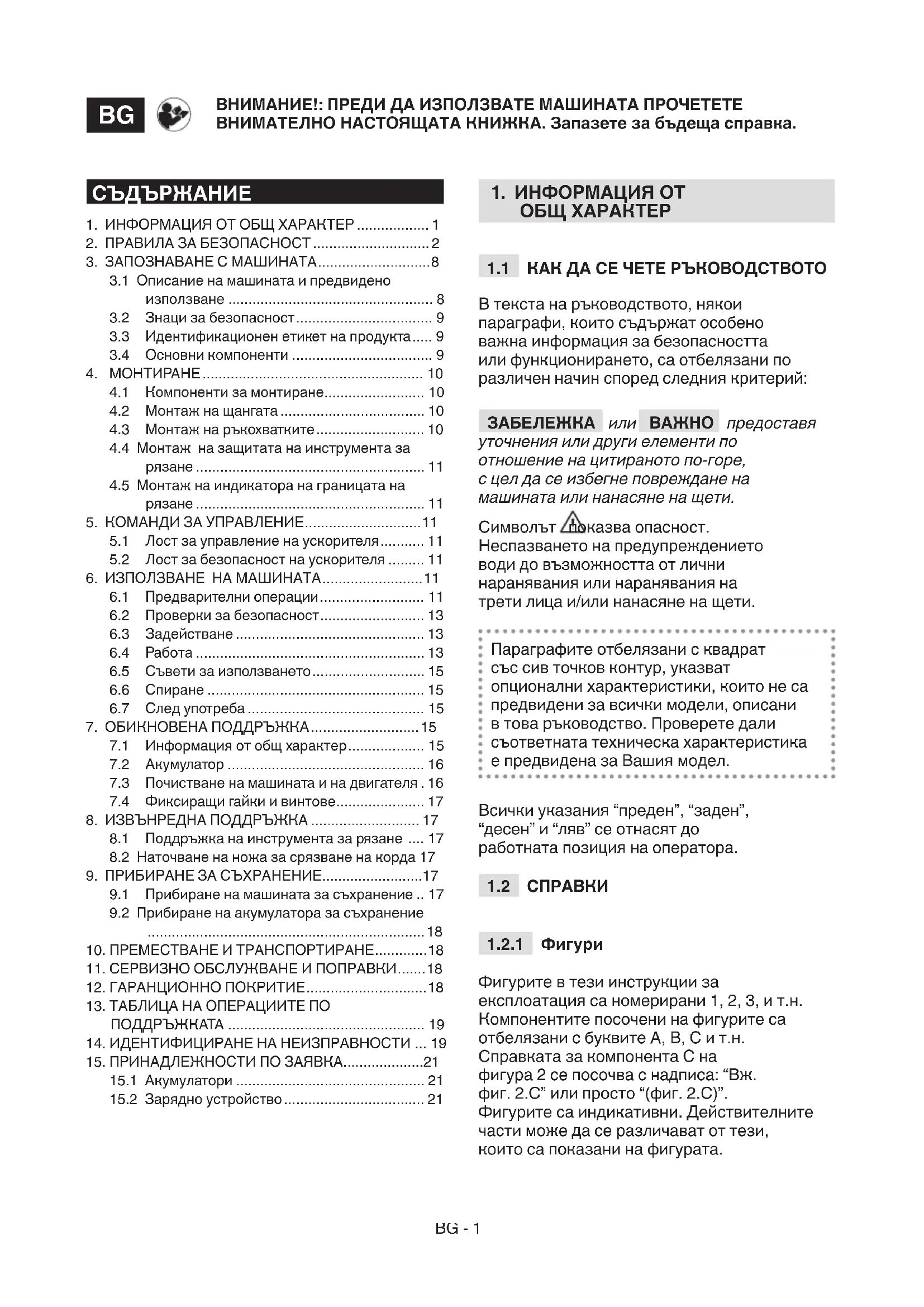 Устройство, което се използва за зареждане на акумулатора (Фиг. 28).BS - 1 PAŽNJA!: PRIJE KORIŠTENJA MAŠINE, PAŽLJIVO PROČITAJTE OVAJ PRIRUČNIK. Sačuvati za naredne potrebe.