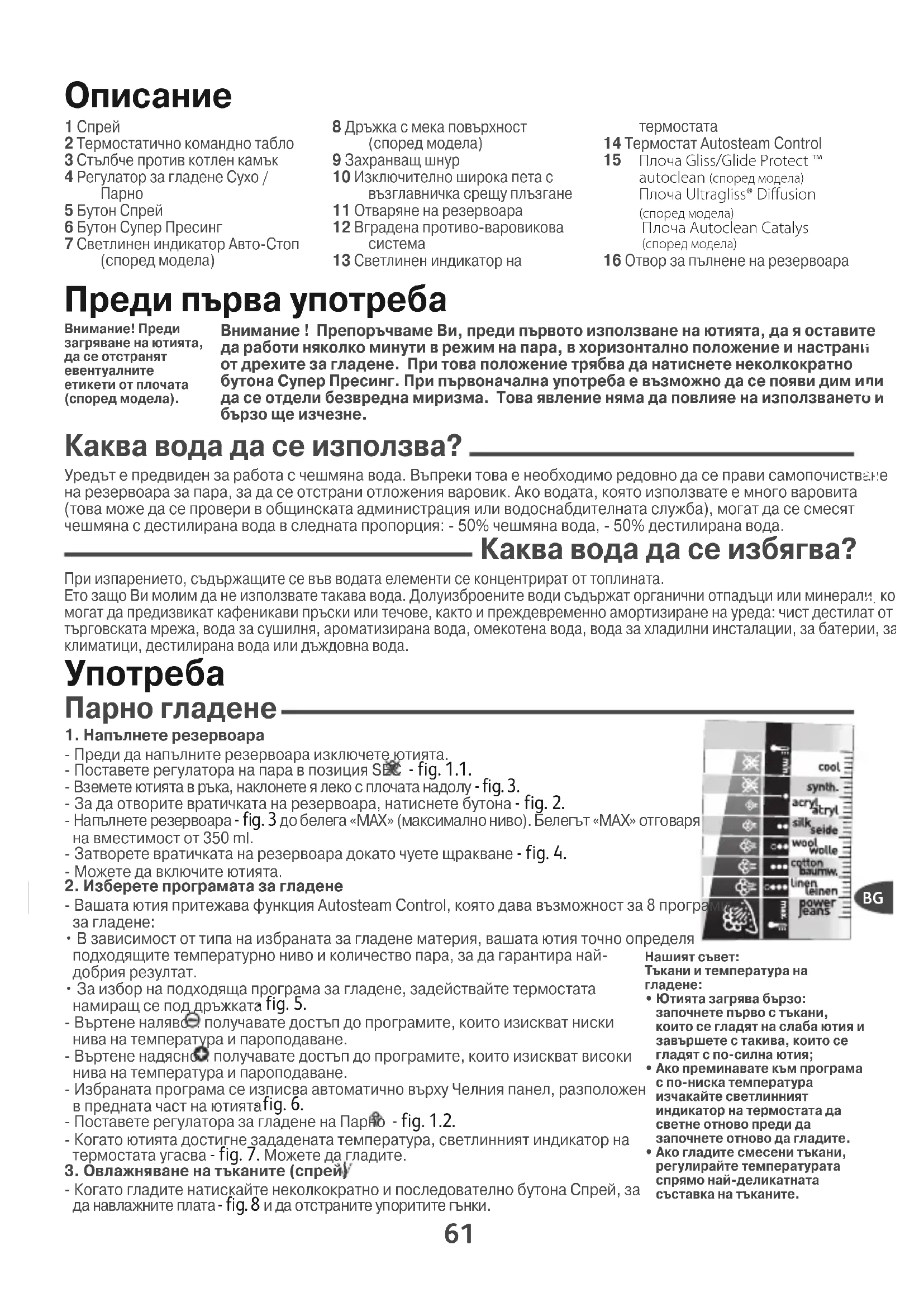 1 Спрей2 Термостатично командно табло3 Стълбче против котлен камък4 Регулатор за гладене Сухо /Парно5 Бутон Спрей6 Бутон Супер Пресинг7 Светлинен индикатор Авто-Стоп(според модела)8 Дръжка с мека повърхност(според модела)9 Захранващ шнур10 Изключително широка пета свъзглавничка срещу плъзгане11 Отваряне на резервоара12 Вградена противо-варовиковасистема13 Светлинен индикатор натермостата14 Термостат Autosteam Control Плоча Gliss/Glide Protect ™autoclean (според модела)Плоча Ultragliss® Diffusion(според модела) лоча Autoclean Catalys(според модела)16 Отвор за пълнене на резервоара Преди първа употреба Внимание ! Препоръчваме Ви, преди първото използване на ютията, да я оставитеда работи няколко минути в режим на пара, в хоризонтално положение и настраниот дрехите за гладене. При това положение трябва да натиснете неколкократнобутона Супер Пресинг. При първоначална употреба е възможно да се появи дим илида се отдели безвредна миризма. Това явление няма да повлияе на използването ибързо ще изчезне. Каква вода да се използва? Уредът е предвиден за работа с чешмяна вода. Въпреки това е необходимо редовно да се прави самопочистванена резервоара за пара, за да се отстрани отложения варовик. Ако водата, която използвате е много варовита(това може да се провери в общинската администрация или водоснабдителната служба), могат да се смесятчешмяна с дестилирана вода в следната пропорция: - 50% чешмяна вода, - 50% дестилирана вода. Каква вода да се избягва? При изпарението, съдържащите се във водата елементи се концентрират от топлината.Ето защо Ви молим да не използвате такава вода. Долуизброените води съдържат органични отпадъци или минерали, коитомогат да предизвикат кафеникави пръски или течове, както и преждевременно амортизиране на уреда: чист дестилат оттърговската мрежа, вода за сушилня, ароматизирана вода, омекотена вода, вода за хладилни инсталации, за батерии, заклиматици, дестилирана вода или дъждовна вода.